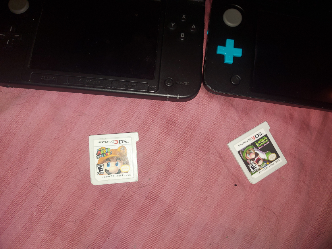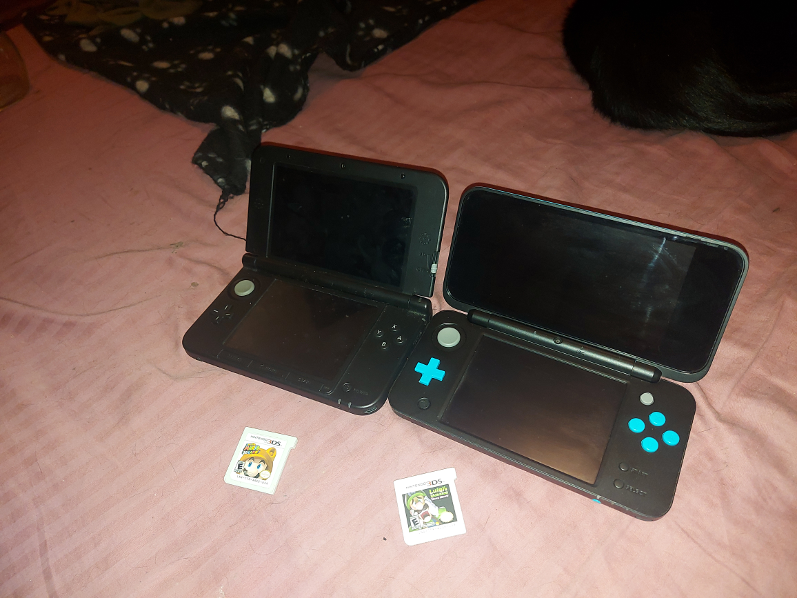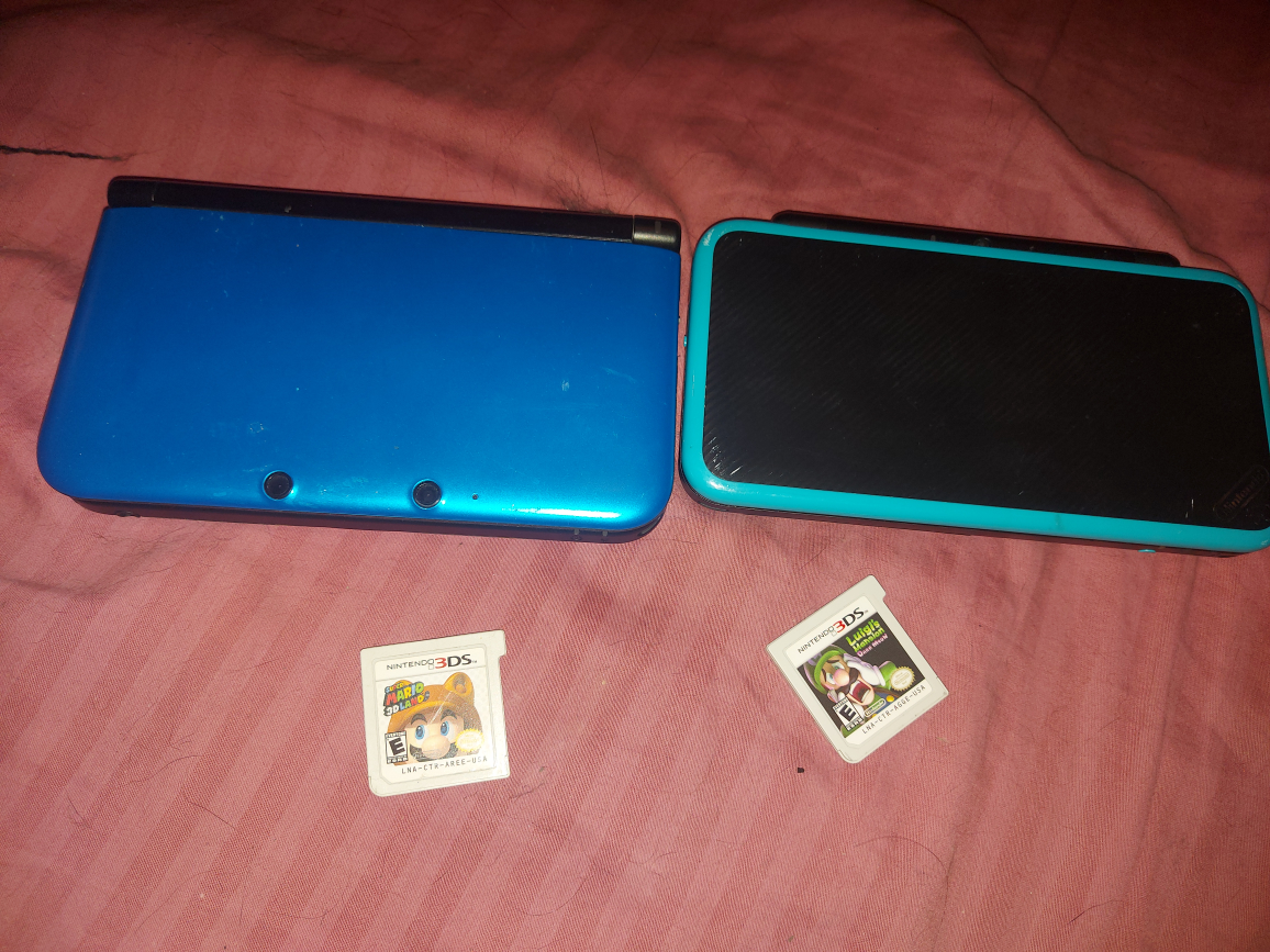 Selling a Nintendo 3DS XL and a Nintendo 2DS. Both come with game cartridges! The 3DS XL is blue and the 2DS is black with blue accents. They are both in good condition and ready for a new home no chargers