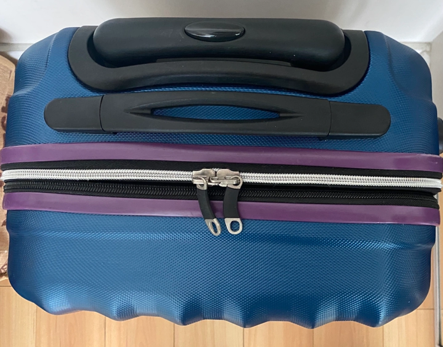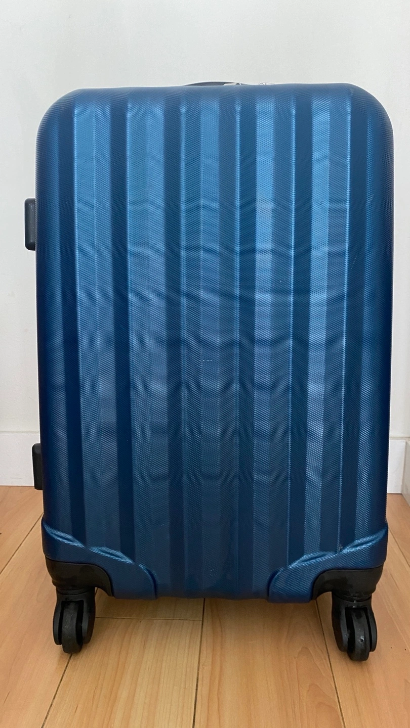 Hard-shell carry-on suitcase.