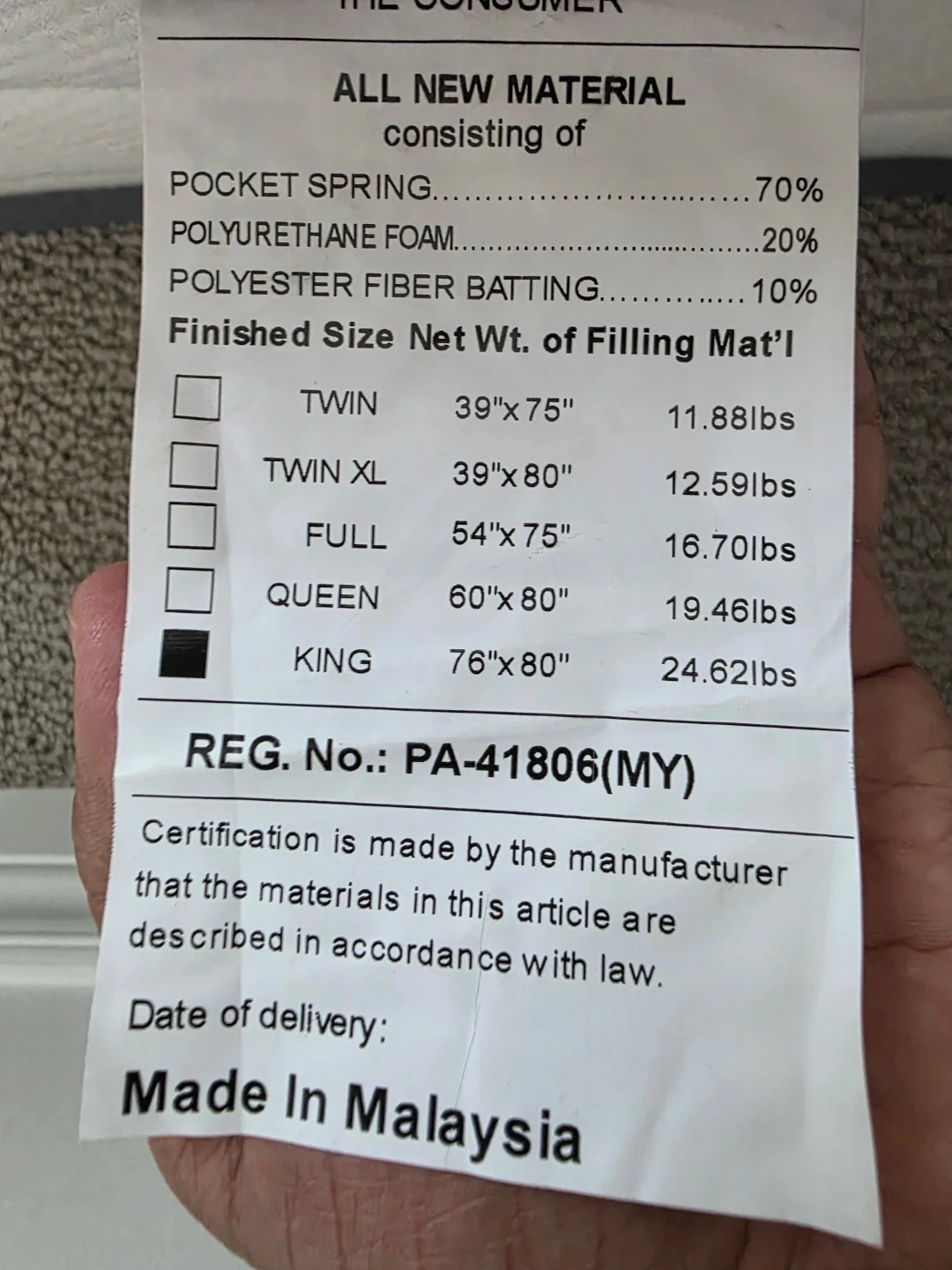 This is a King-sized Martisiluna mattress. It's made with pocket springs, polyurethane foam, and polyester fiber batting. A comfortable mattress for a good night's sleep!