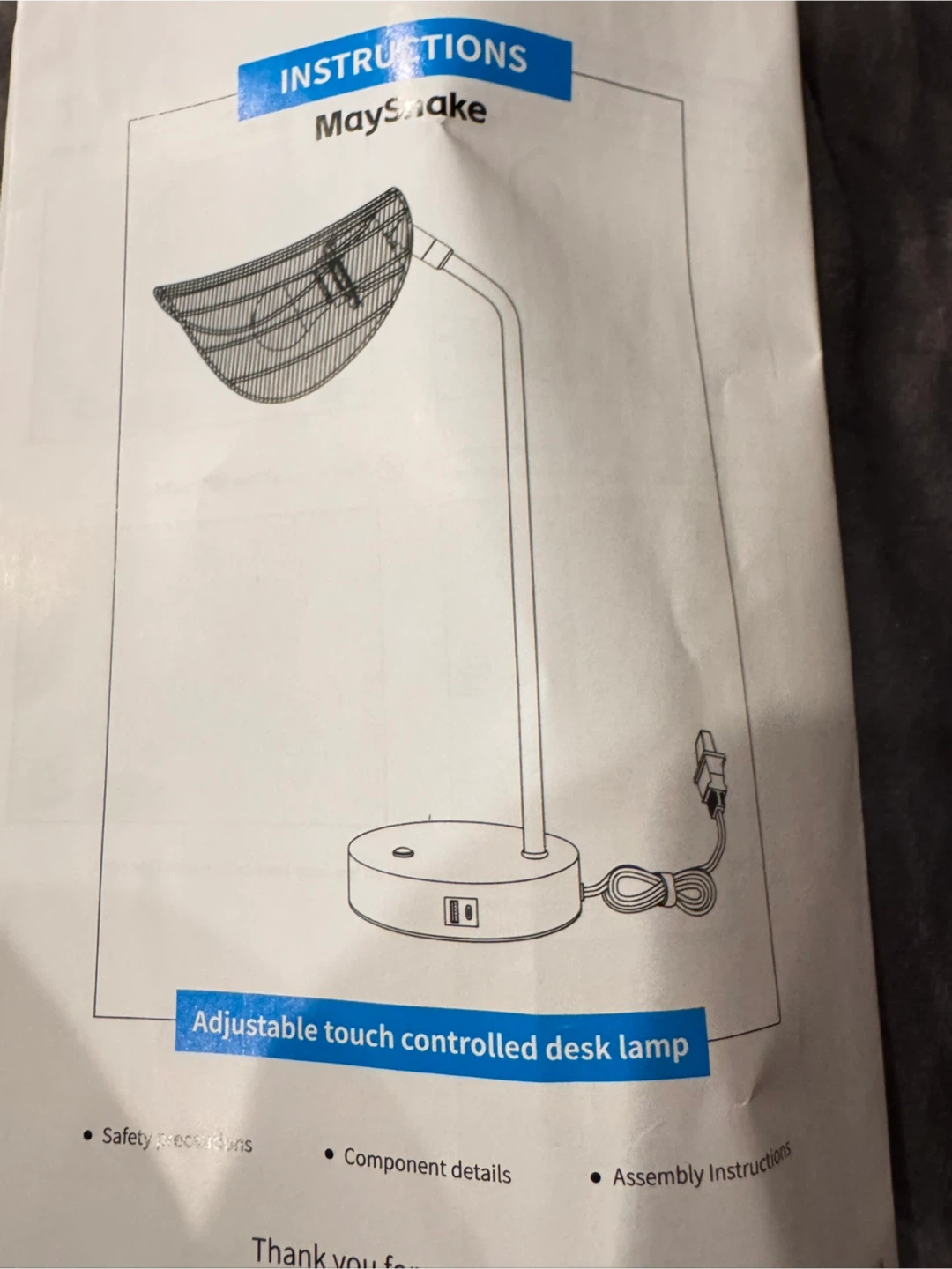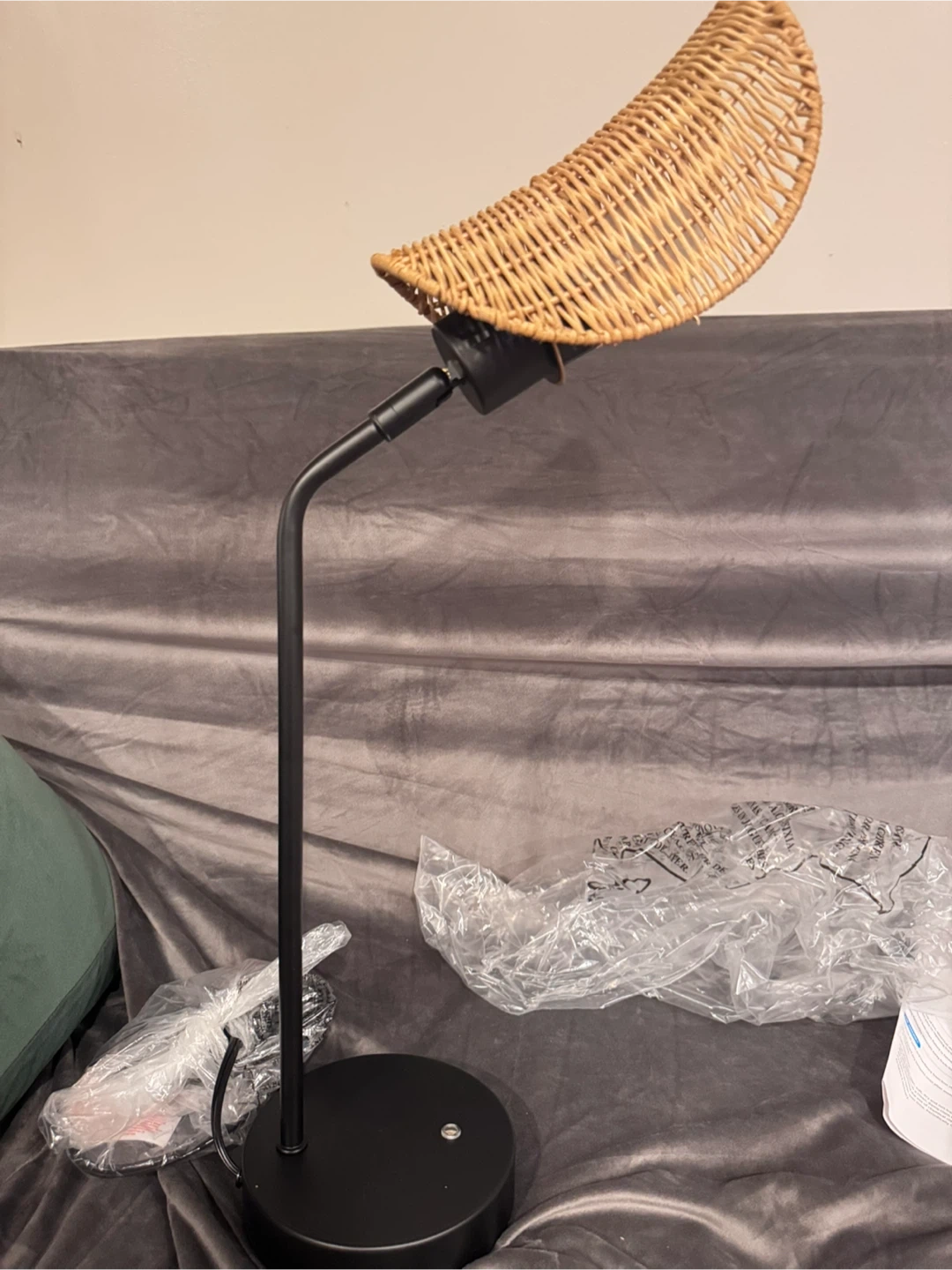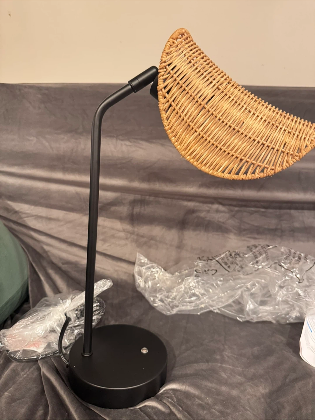 Selling a MayShake adjustable touch controlled desk lamp! It features a stylish wicker shade and a sleek black base. The lamp has a three-stage dimming function, letting you adjust the brightness to your liking. Assembly instructions are included!
