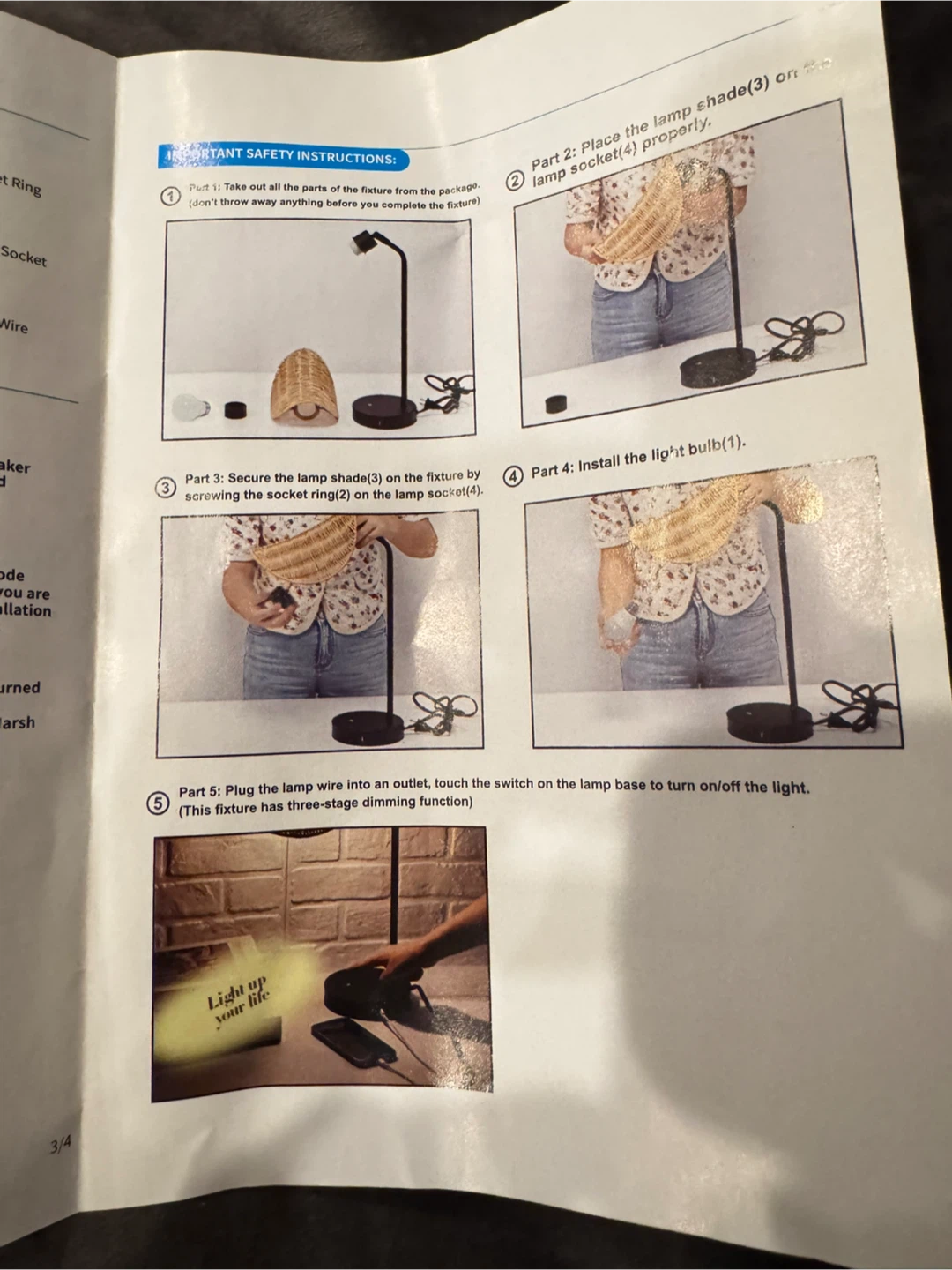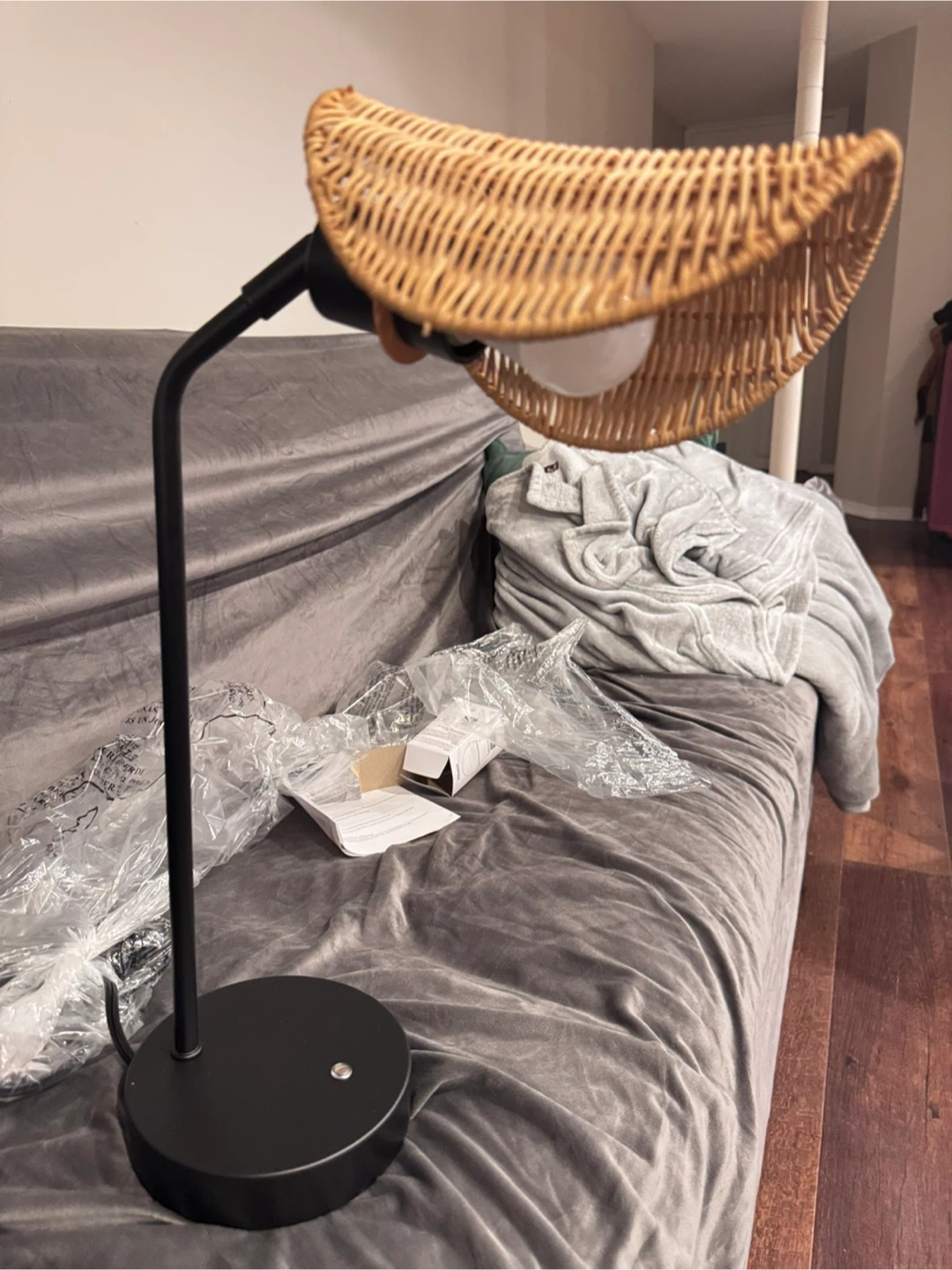 Selling a MayShake adjustable touch controlled desk lamp! It features a stylish wicker shade and a sleek black base. The lamp has a three-stage dimming function, letting you adjust the brightness to your liking. Assembly instructions are included!