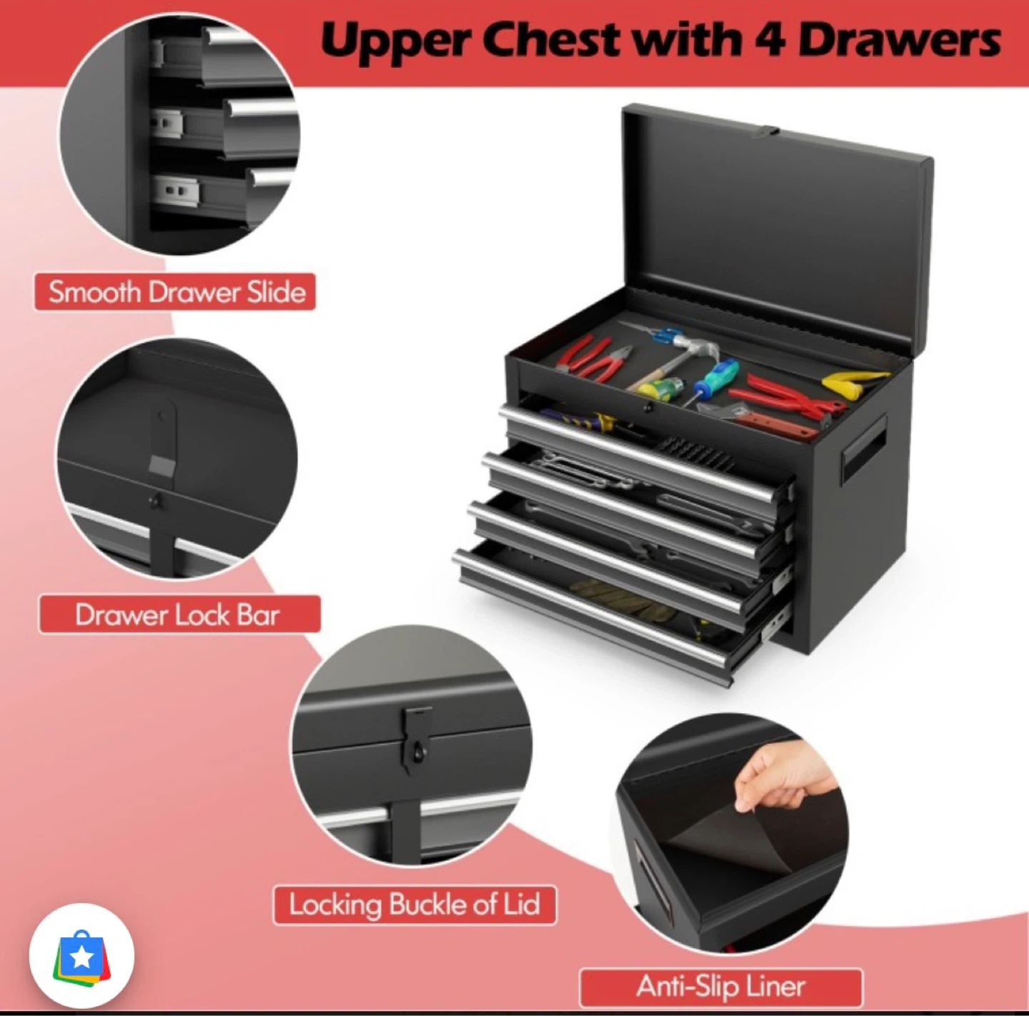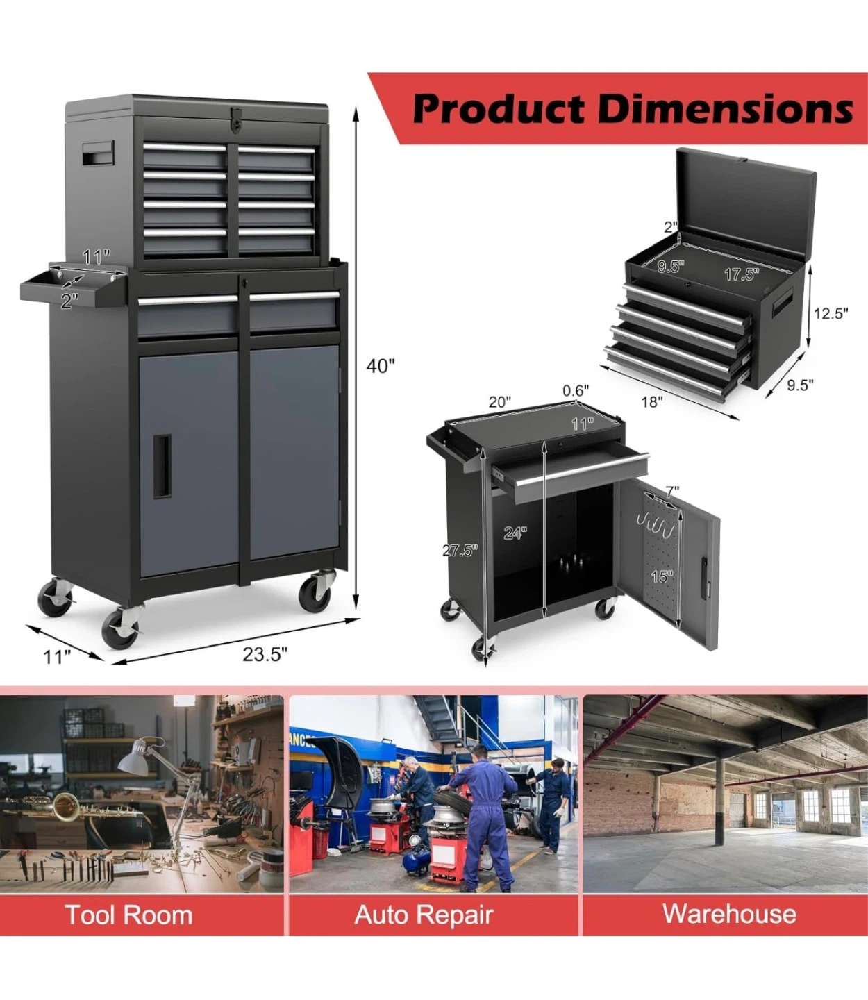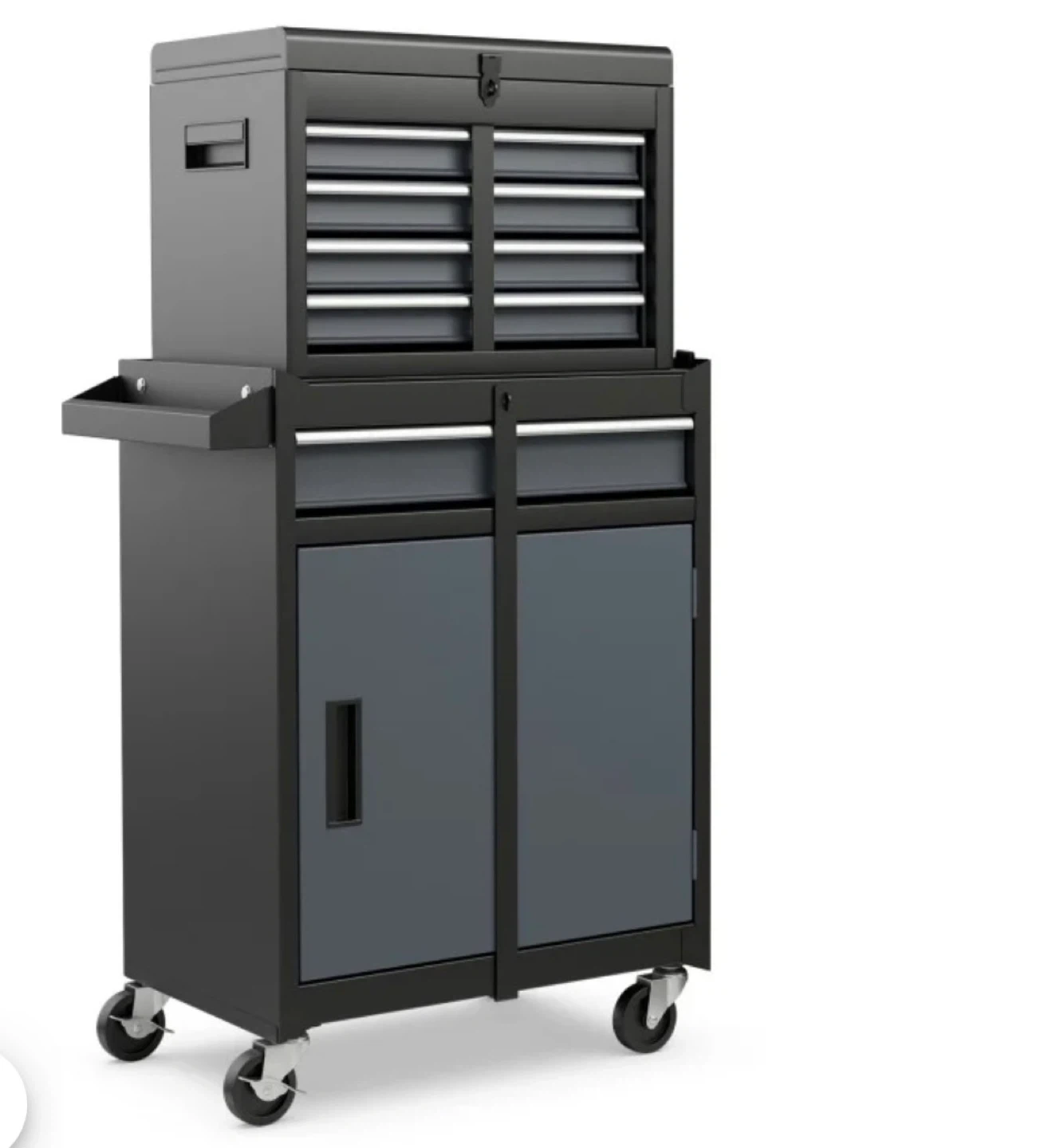 Brand new 2-in-1 tool chest and cabinet with detachable top chest, multiple drawers, and rolling wheels. Made from durable powder-coated metal with locking system for safety. Ideal for garage, workshop, or home use.
