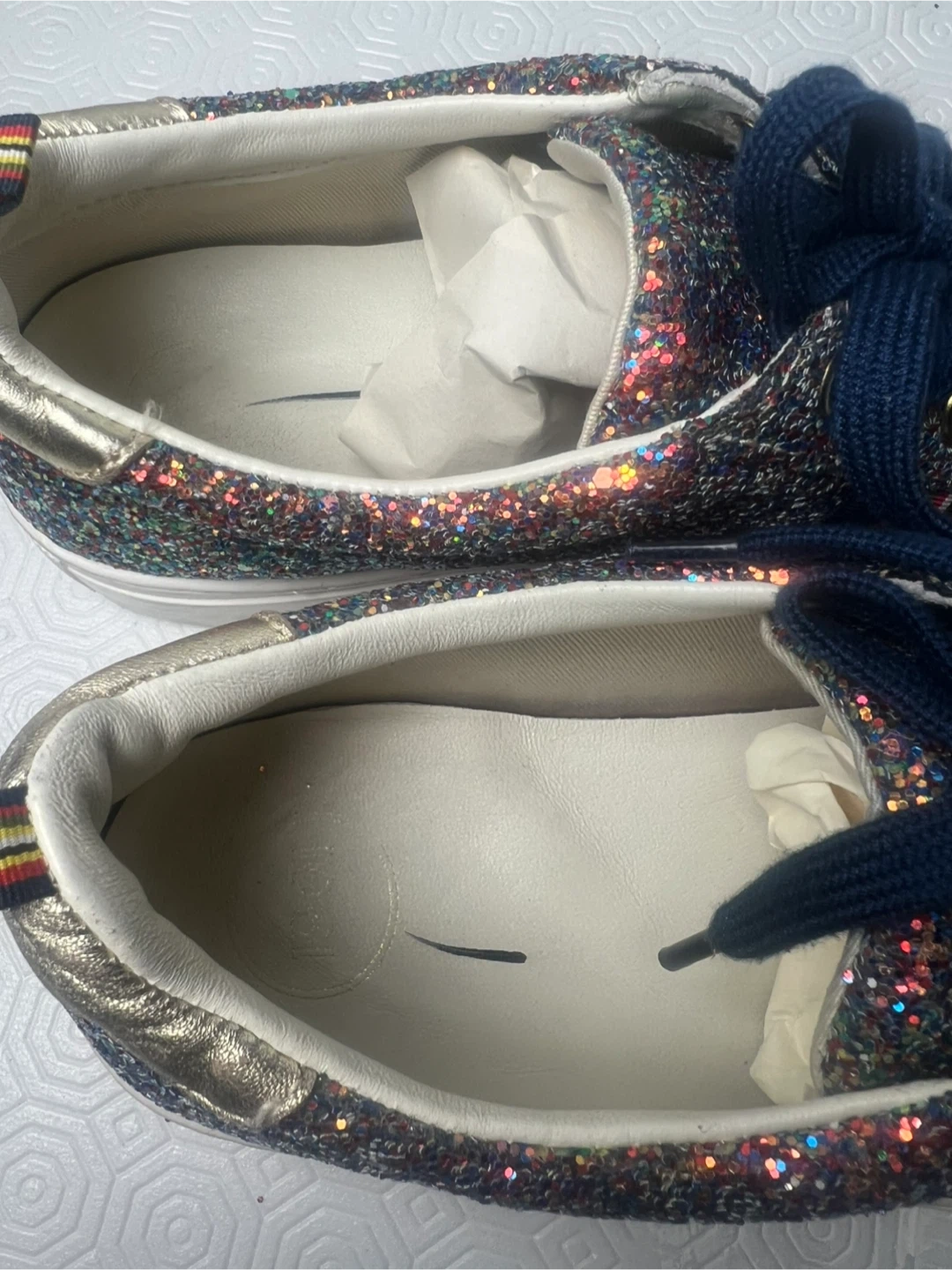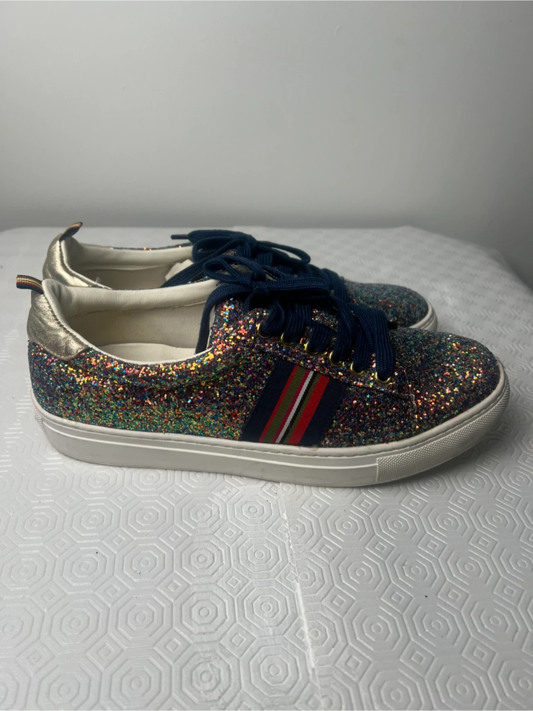 Sparkly glitter sneakers with navy blue laces and gold heel accents. They feature a colourful stripe detail on the side. The soles are white rubber.