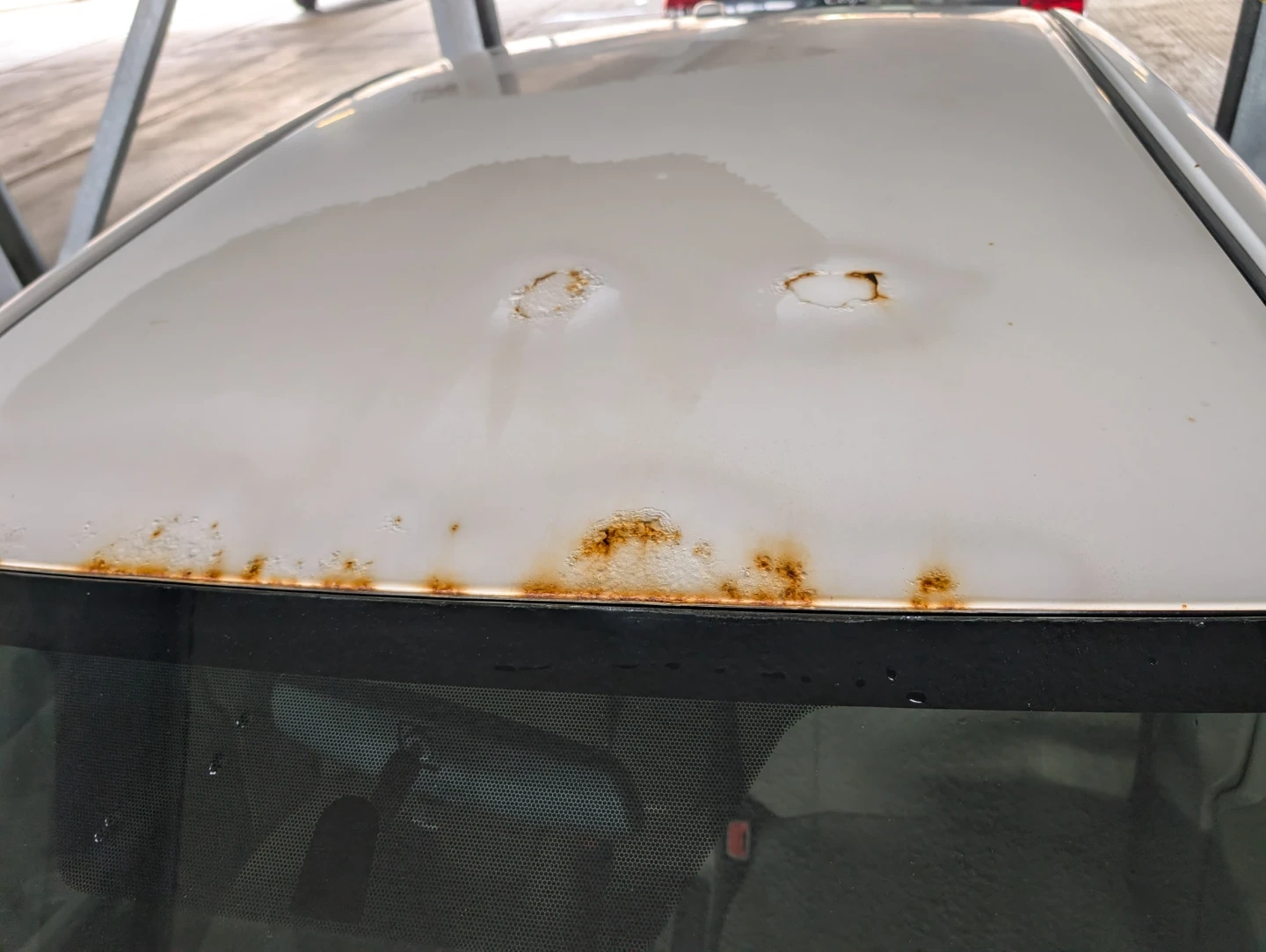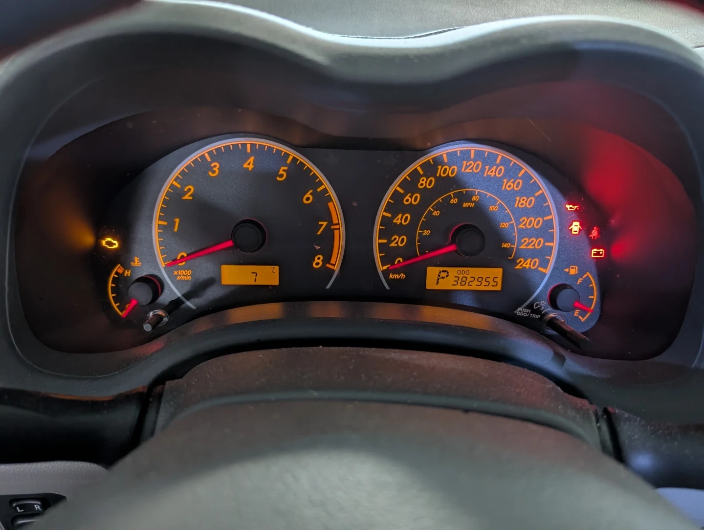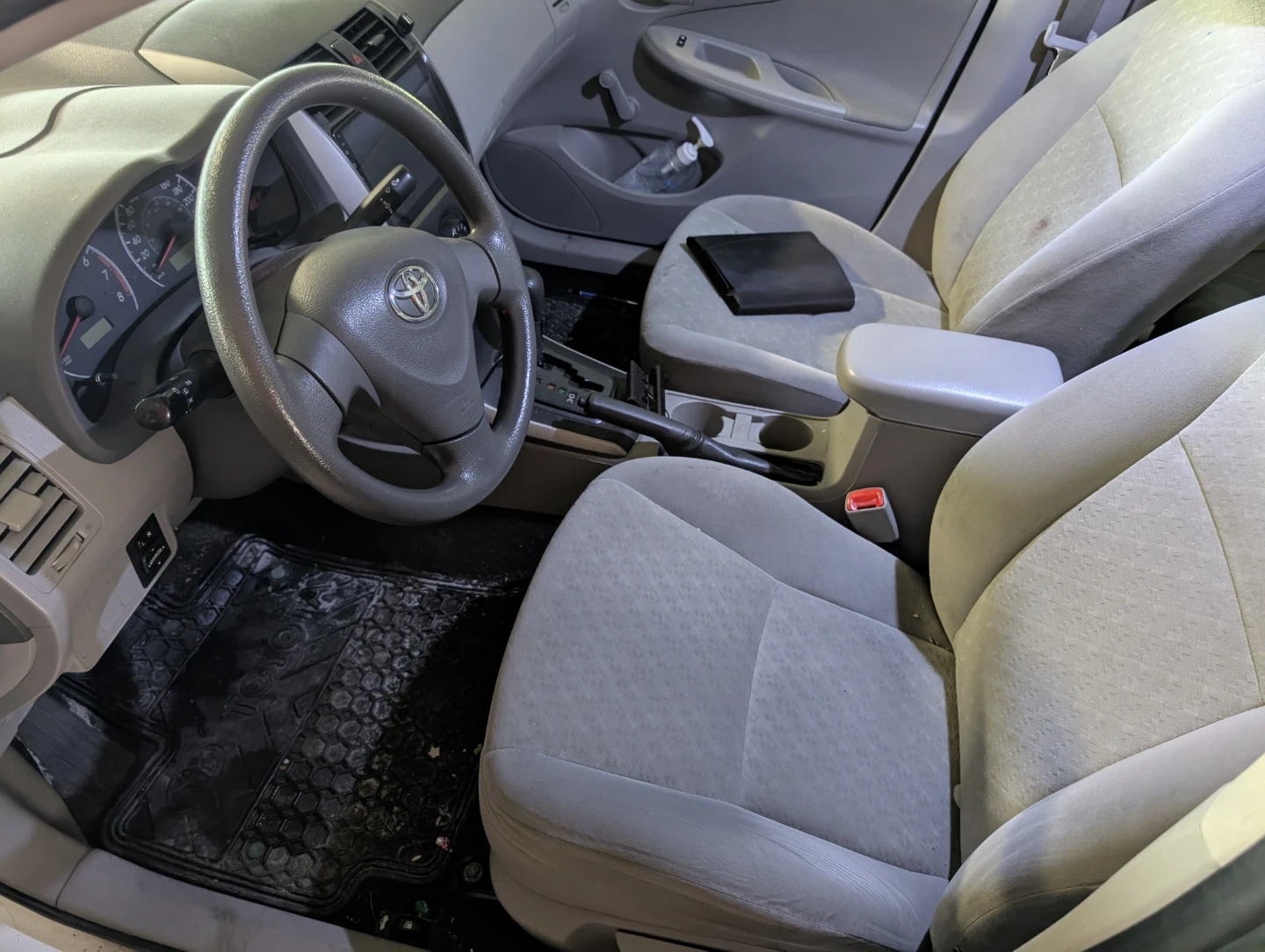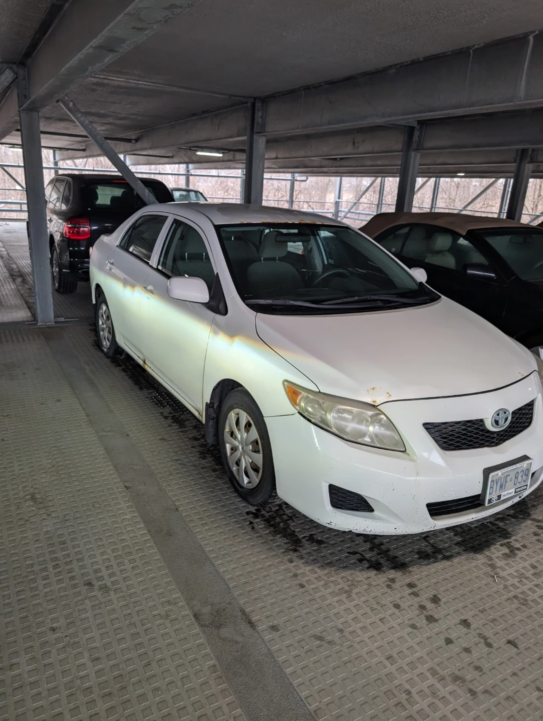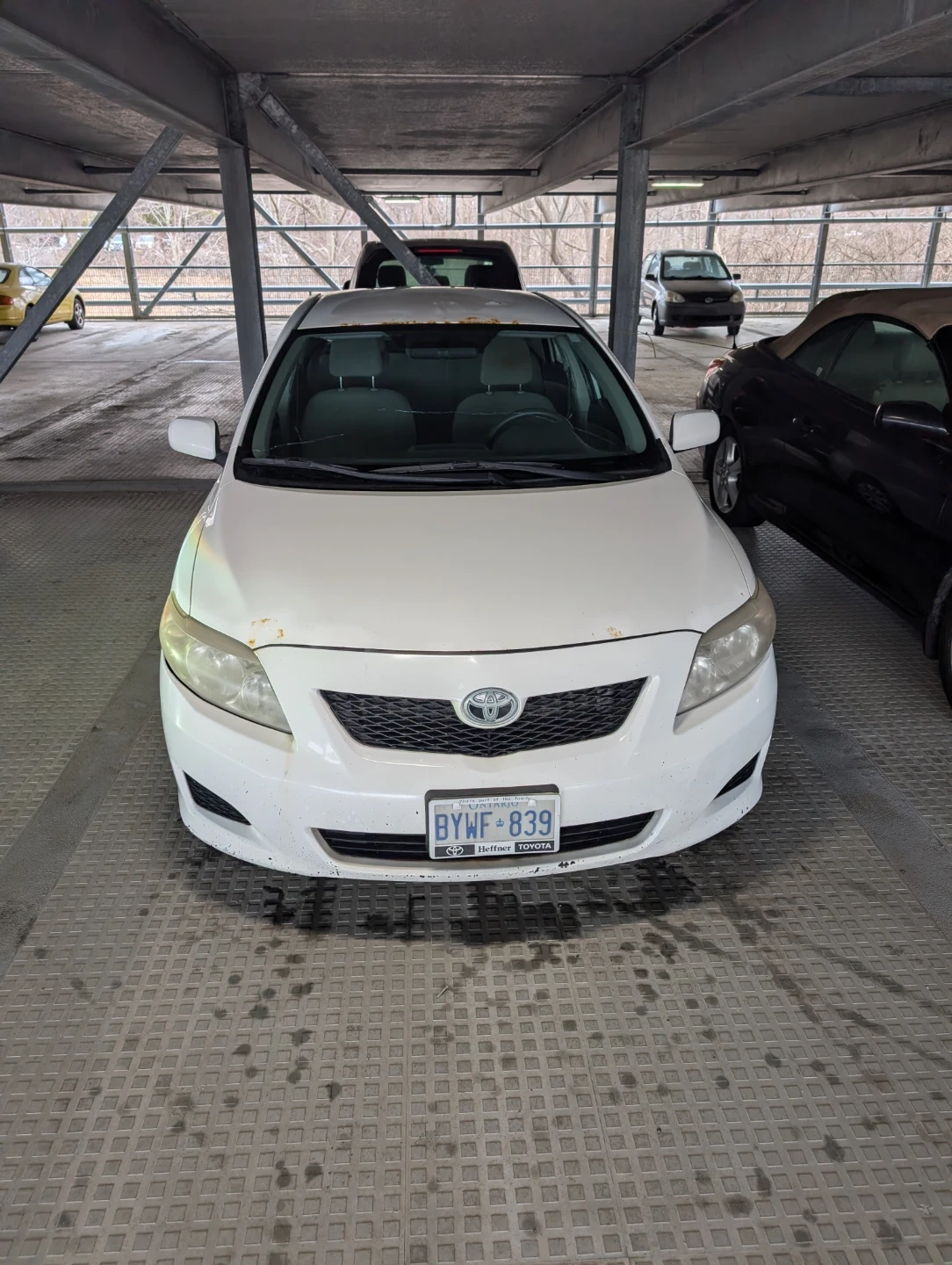 A white four-door Toyota Corolla sedan. The interior is cloth upholstered. Car is sold as is and has 380km all hi-way miles