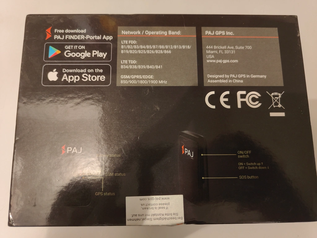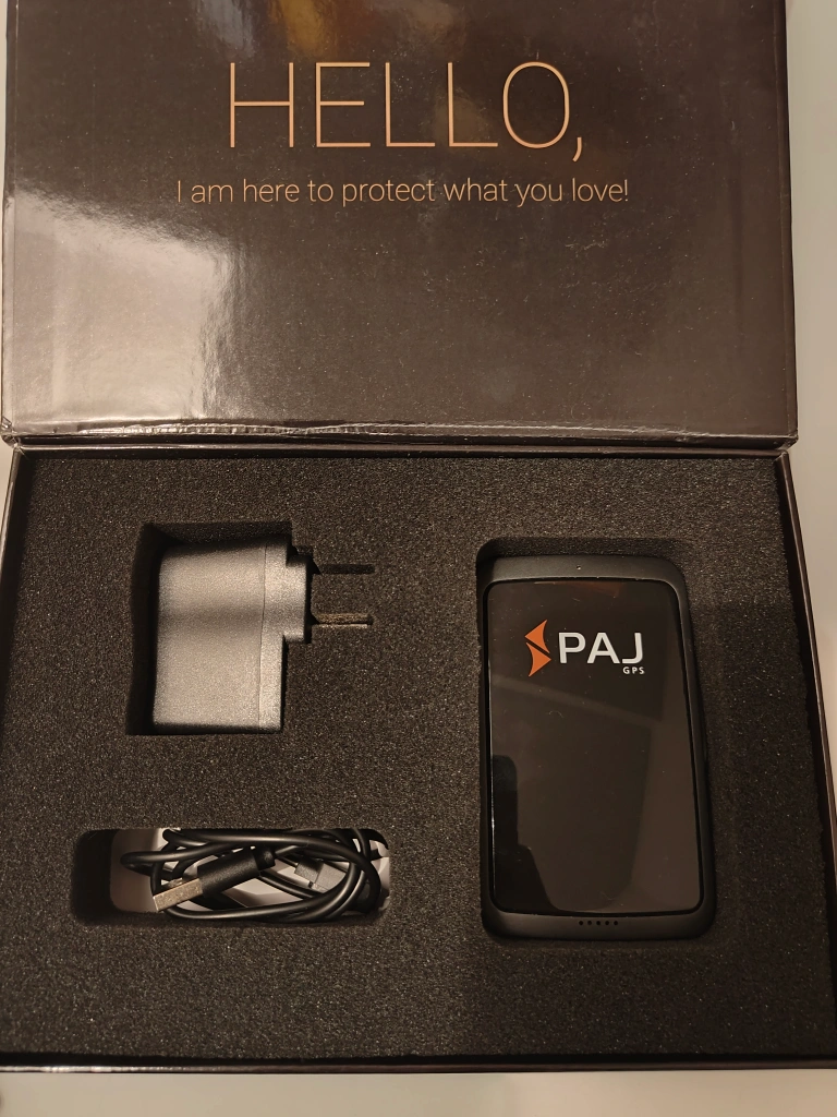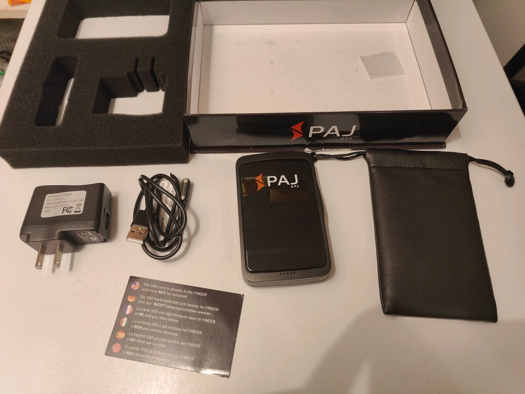 A PAJ Allround Finder 4G GPS Tracker, comes with a USB wall charger, cable, and carrying pouch.