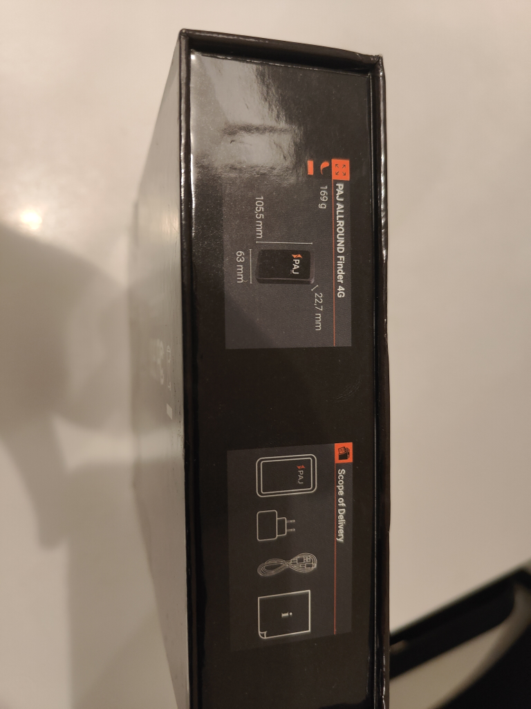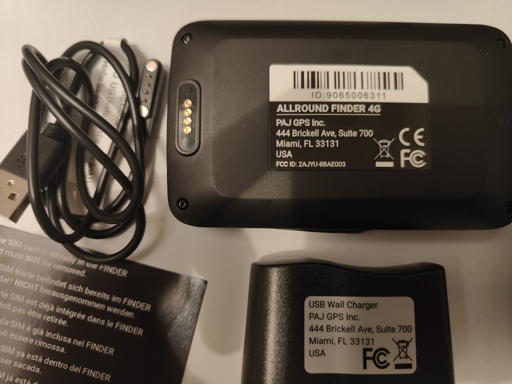 A PAJ Allround Finder 4G GPS Tracker, comes with a USB wall charger, cable, and carrying pouch.
