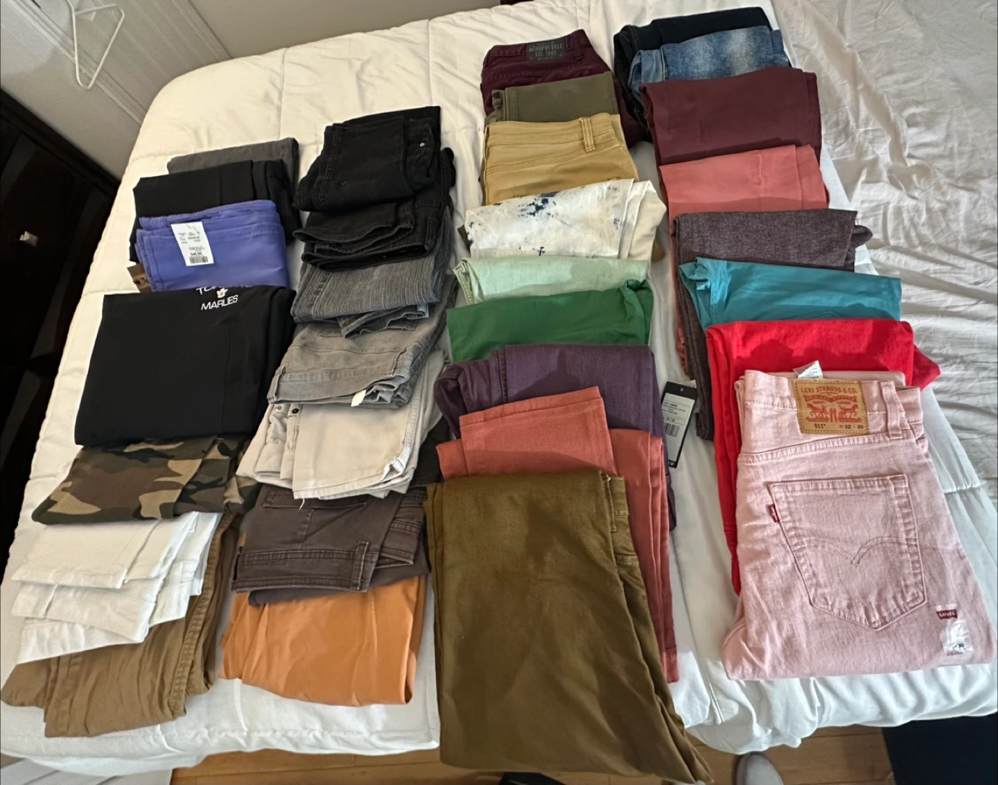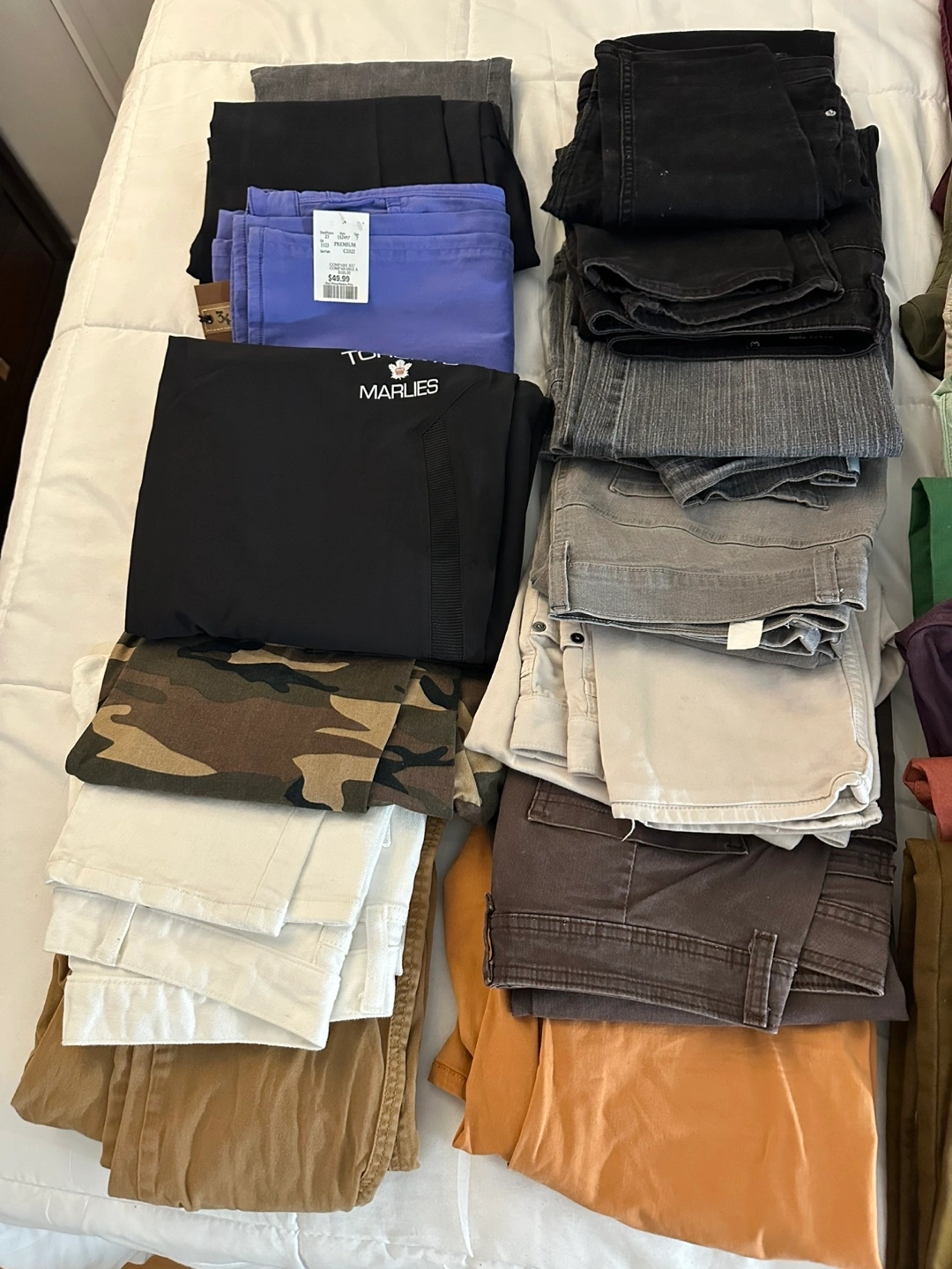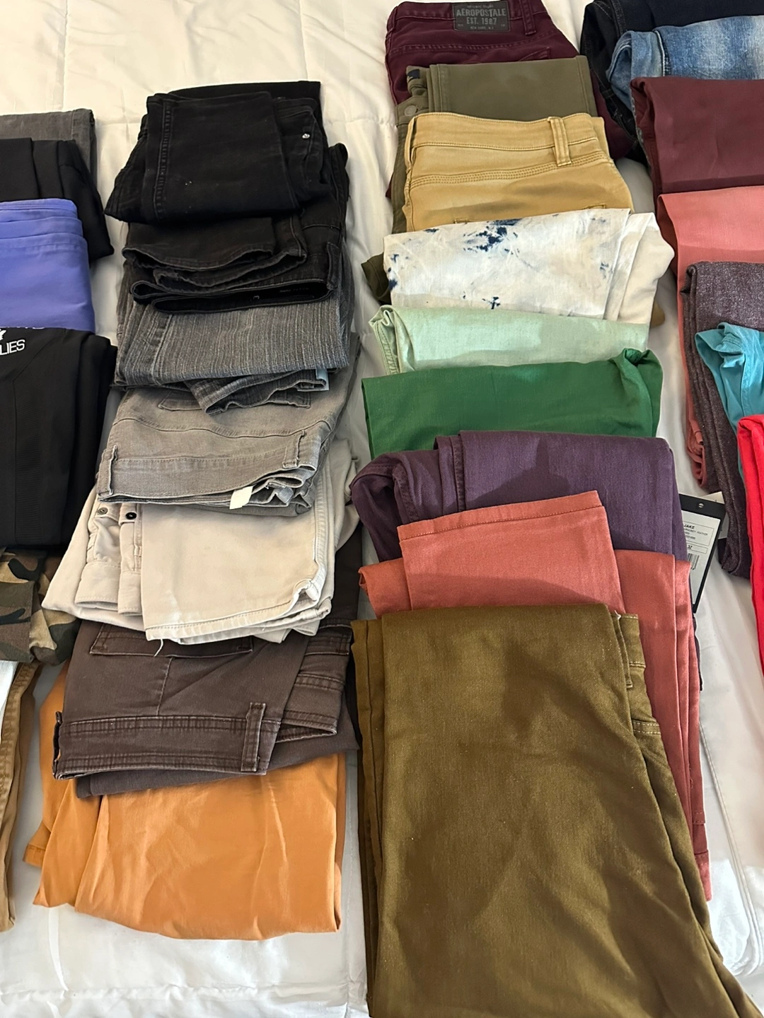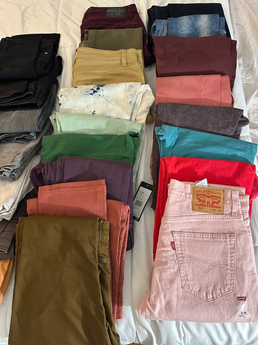 Selling a mixed lot of jeans, pants in various colours, brands, and sizes. There are jeans, chinos, and other styles. Brands include Levi's, Aeropostale, and others. Perfect for someone looking to expand their wardrobe with a variety of options