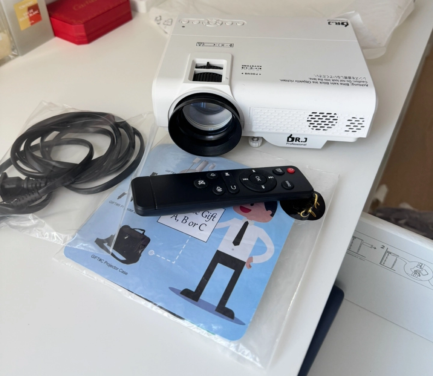 Selling a DRJ Professional projector in great condition! It comes with a remote, the manual, and extra bulbs. This projector is compatible with multiple devices such as PS5, TV Box Fire Stick, PC, and Phone. It also has a 3.5mm Headphone Jack and USB port. Perfect for movie nights or presentations!