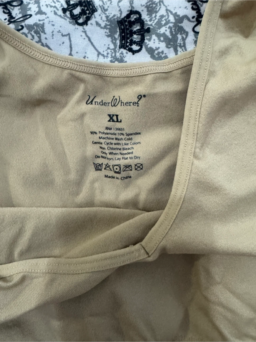This beige, seamless tank top from UnderWhere? is a size XL. It's made of 90% polyamide and 10% spandex for a comfortable fit. Gentle cycle, cold wash. Lay flat to dry. It's perfect for everyday layering! Llévala a 3$