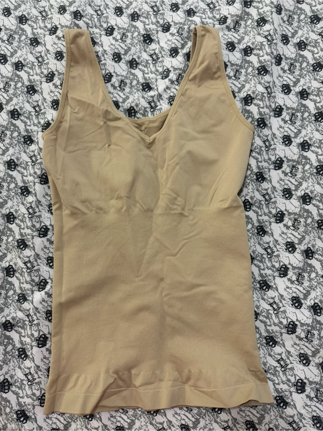 This beige, seamless tank top from UnderWhere? is a size XL. It's made of 90% polyamide and 10% spandex for a comfortable fit. Gentle cycle, cold wash. Lay flat to dry. It's perfect for everyday layering! Llévala a 3$