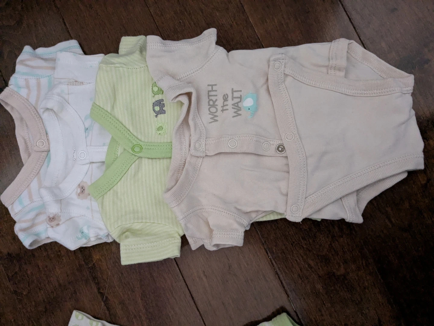 A collection of baby bodysuits in various colours and patterns. They feature cute designs and are in great condition, ready for a new little one