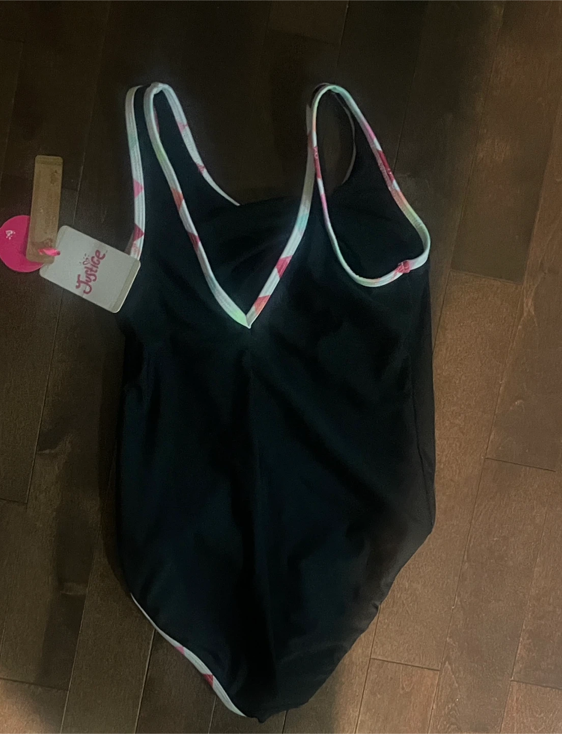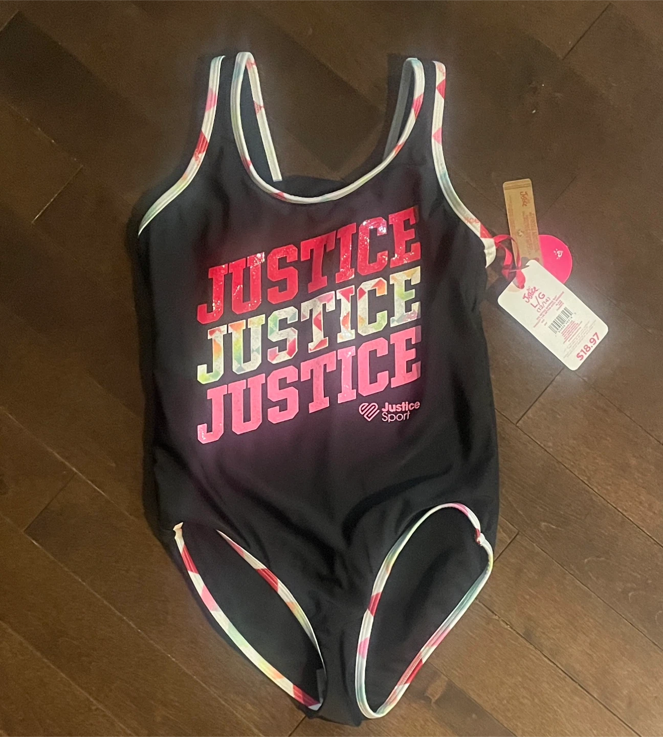 This black Justice Sport swimsuit features a repeating "JUSTICE" graphic with colourful accents. It has contrasting trim along the straps and leg openings. Size L/G.