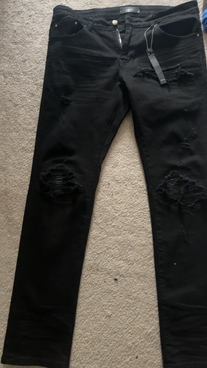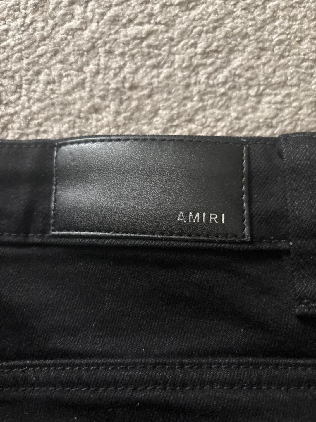 These are AMIRI black jeans with a distressed design. They're a size 33 waist. Perfect for adding an edge to your outfit!
