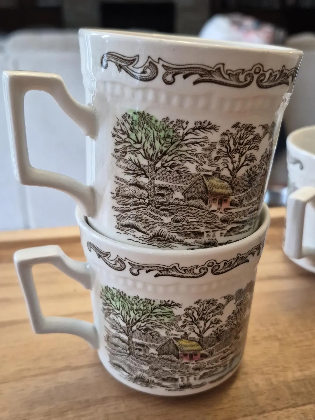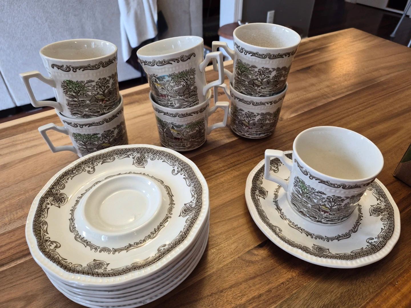 Set of 7 vintage teacups and saucers with a charming scenic pattern. They're made of ceramic and feature a classic cottagecore design. This set is perfect for enjoying your favourite hot beverages.