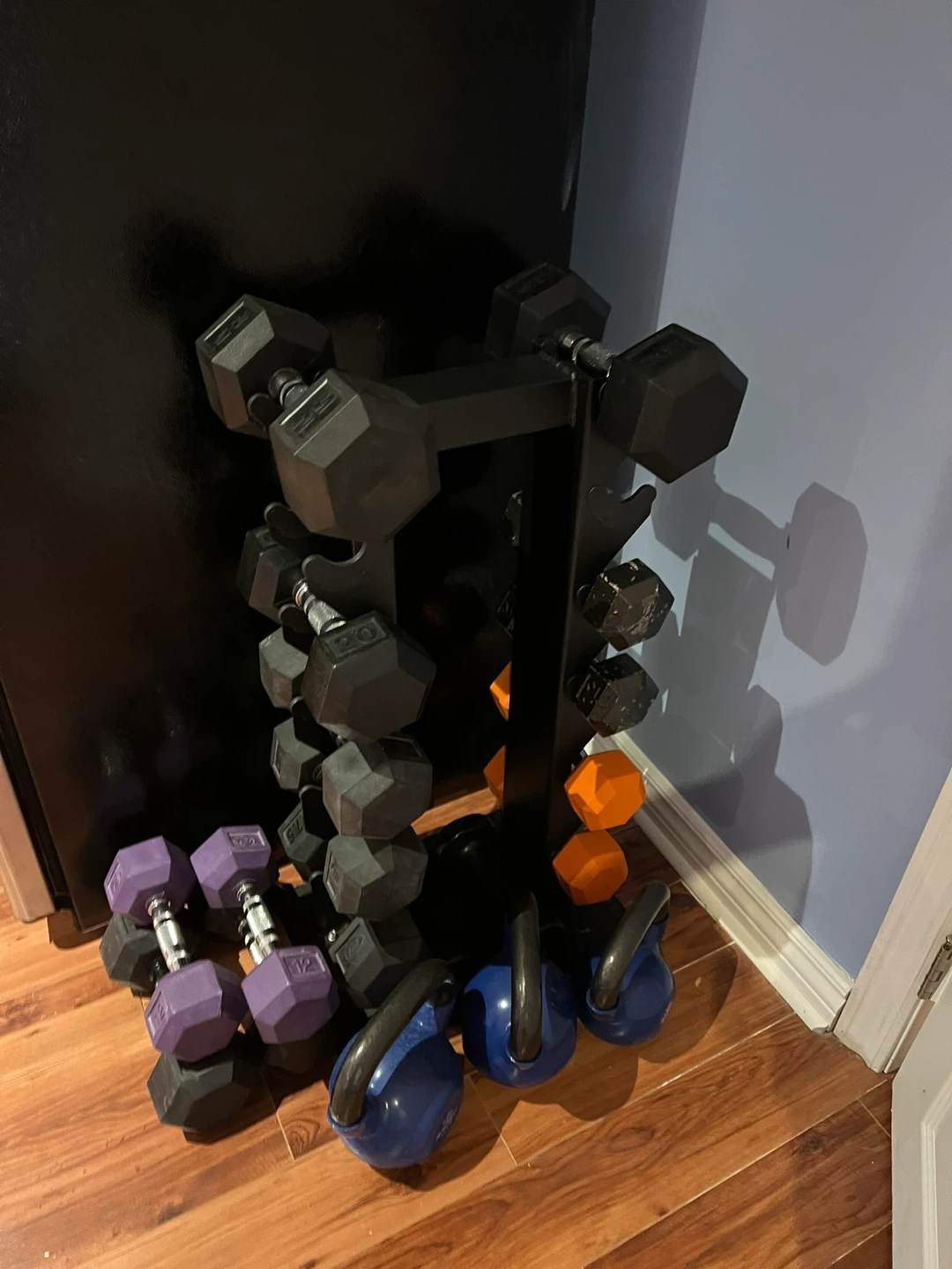 This set includes various hex dumbbells and the vertical rack