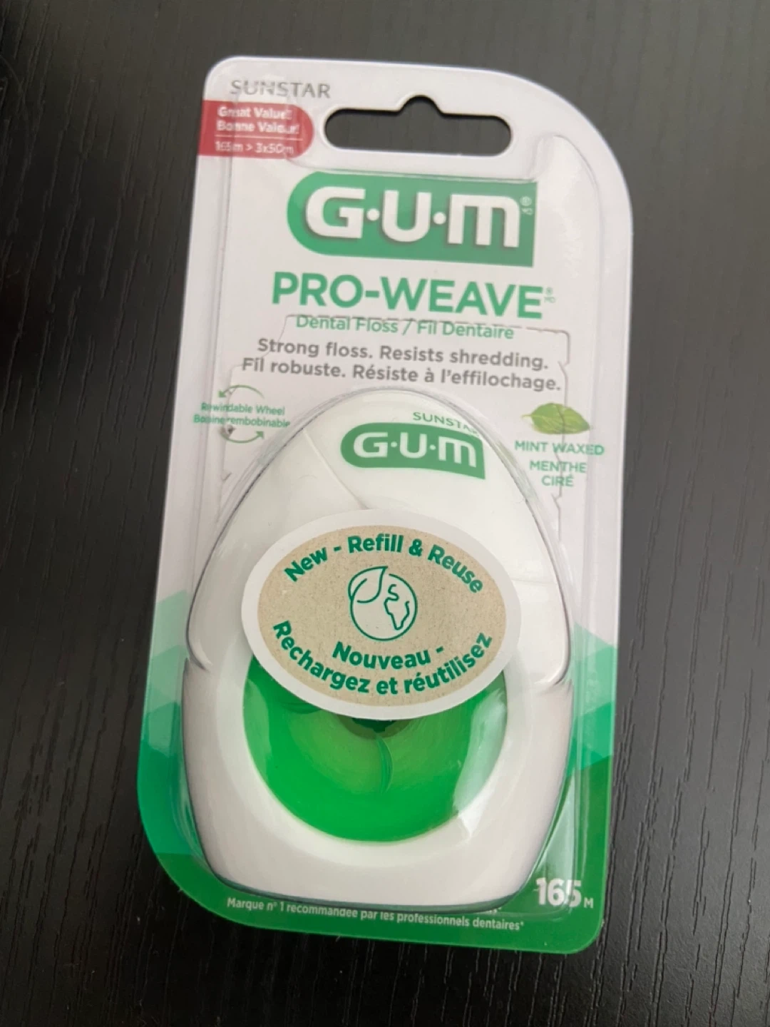 This GUM PRO-WEAVE dental floss is mint waxed and comes in a refillable and reusable dispenser. It features a rewind wheel to prevent wasted floss and includes 165m of strong, shred-resistant floss. Packaging is made from 80% recycled material.