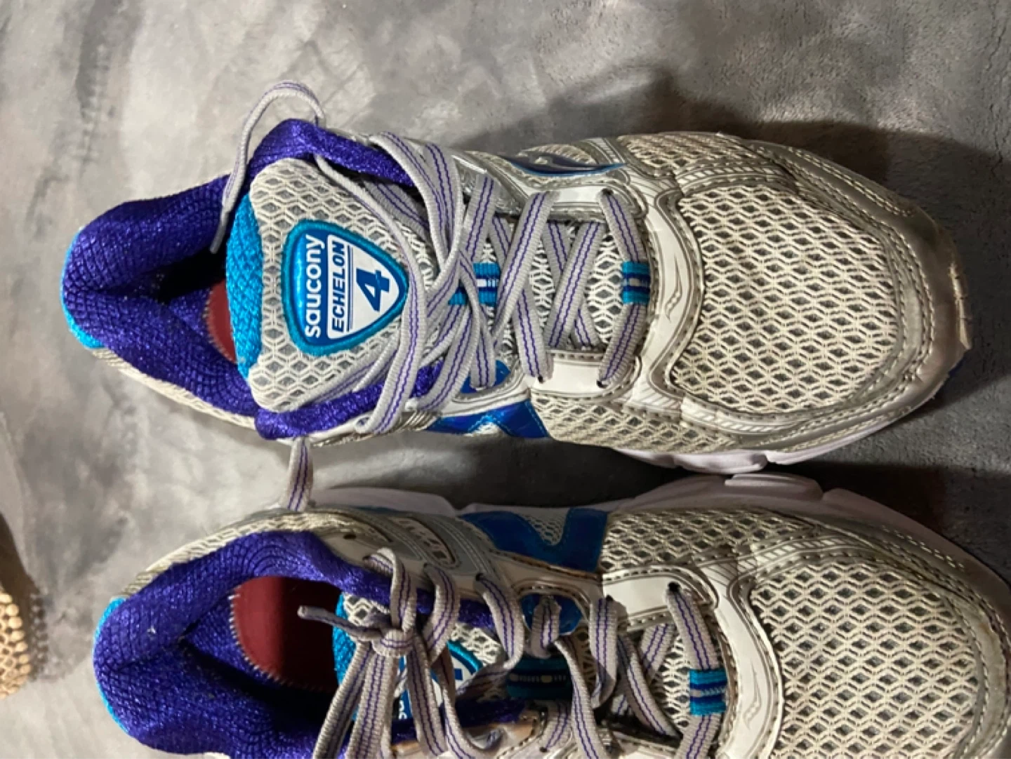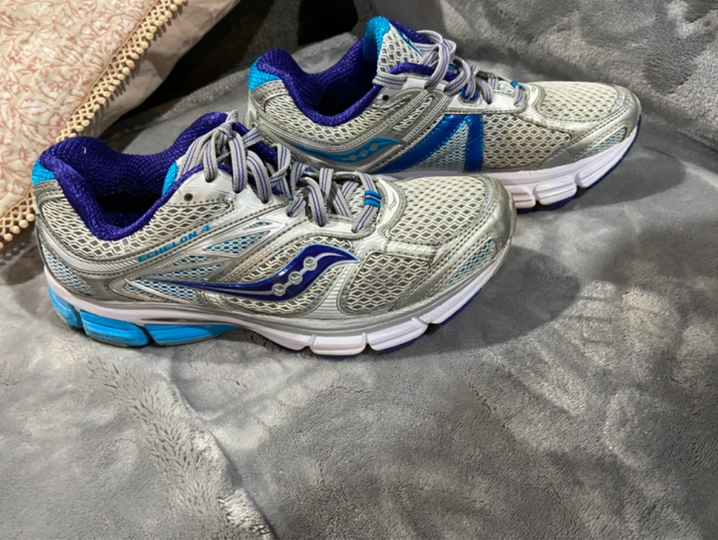 These are women's Saucony Echelon 4 running shoes. They're silver, blue, and white with purple accents. Features synthetic/nylon upper and rubber outsole. 30 obo