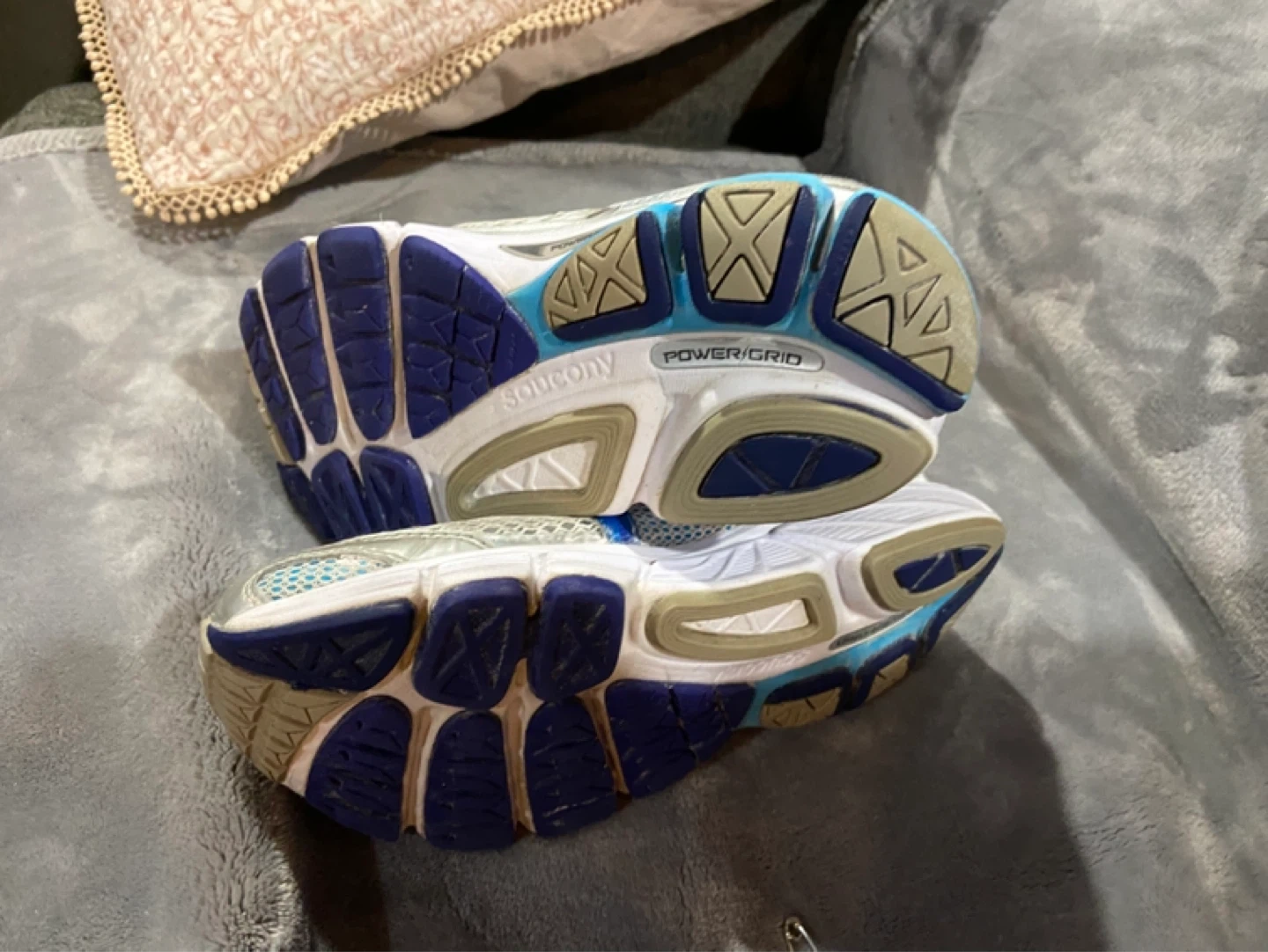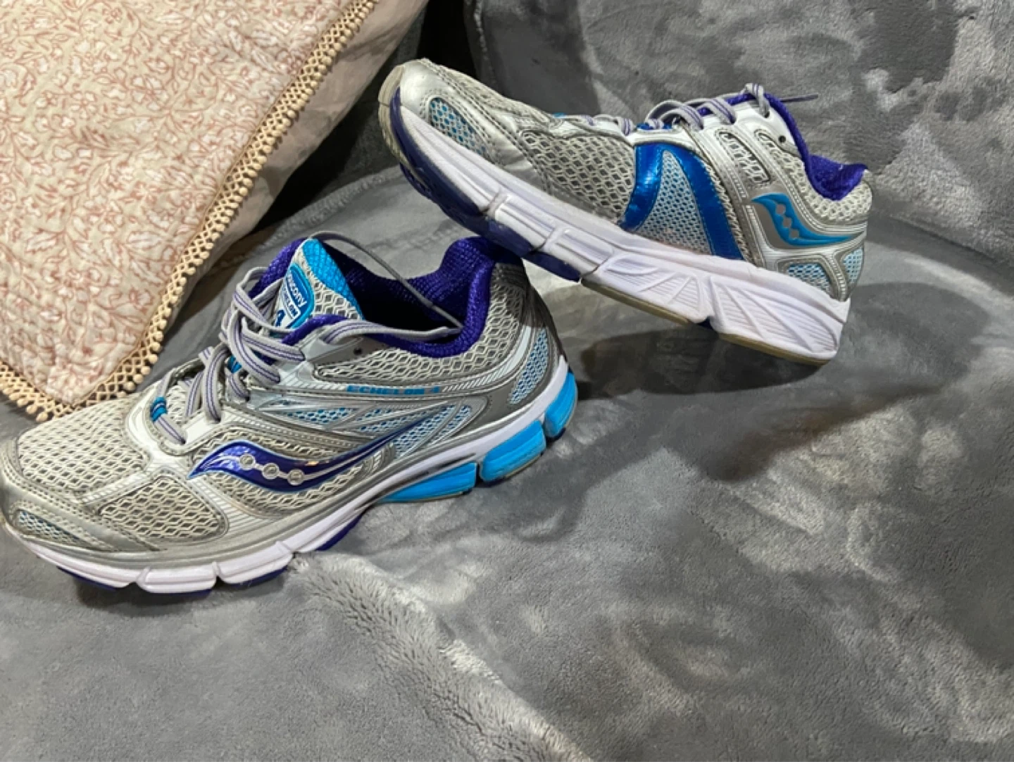 These are women's Saucony Echelon 4 running shoes. They're silver, blue, and white with purple accents. Features synthetic/nylon upper and rubber outsole. 30 obo