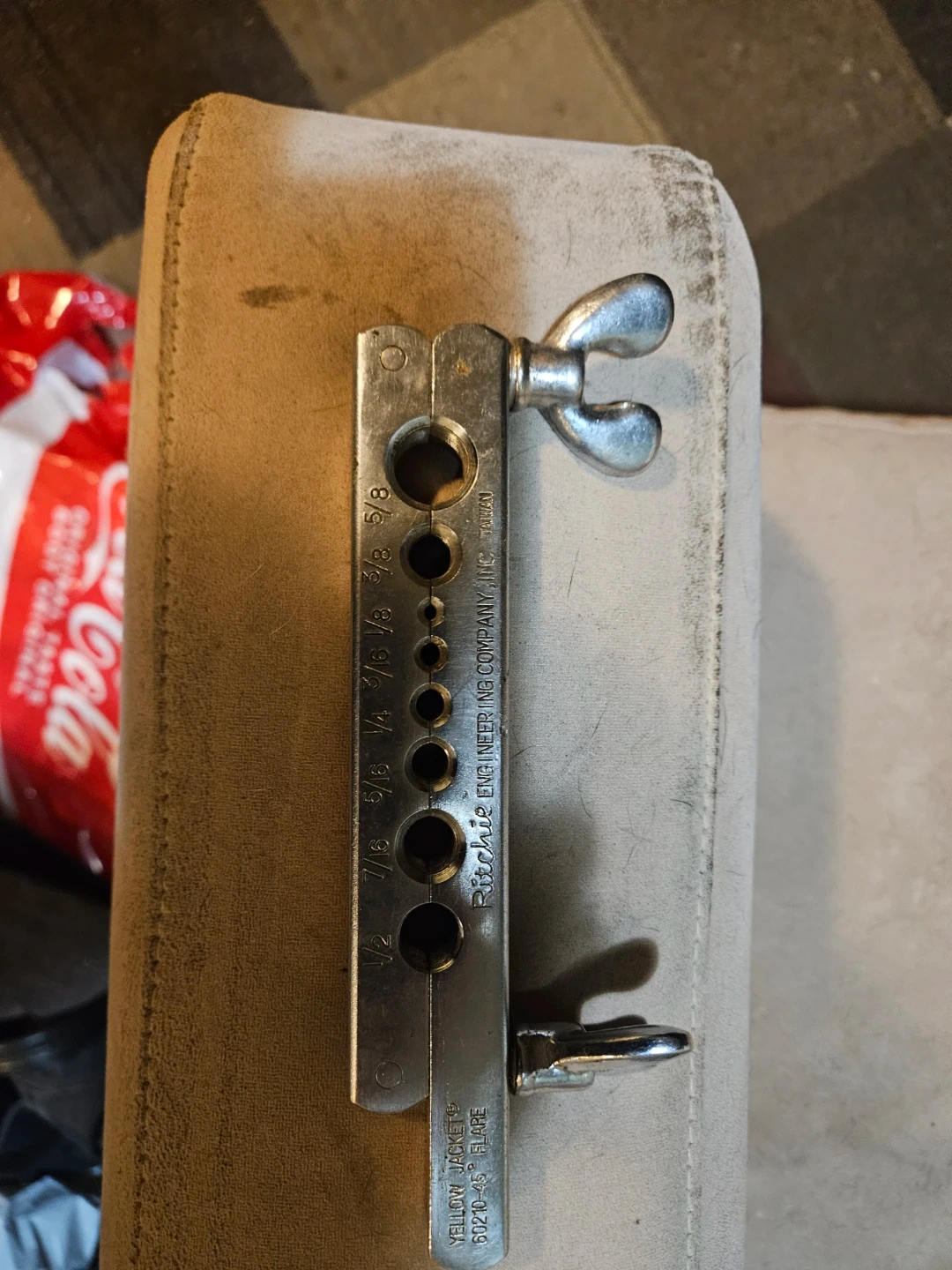 Ritchie Engineering Yellow Jacket flaring tool for 45-degree flares. It has sizes 1/2, 7/16, 5/16, 1/4, 3/16, 1/8, 3/8, and 5/8. This tool is made in Taiwan. It's useful for plumbing and automotive work requiring precise tube flaring.