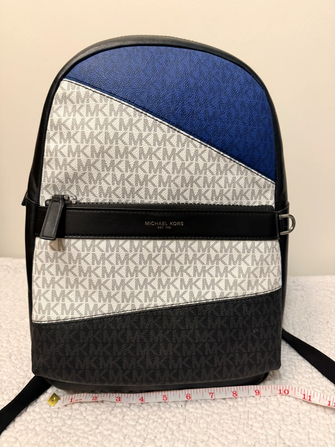 A Michael Kors backpack with MK all-over print and colourblock design. It features adjustable straps and a zippered front pocket. This bag is great for everyday use.