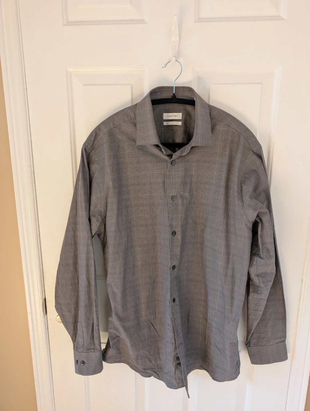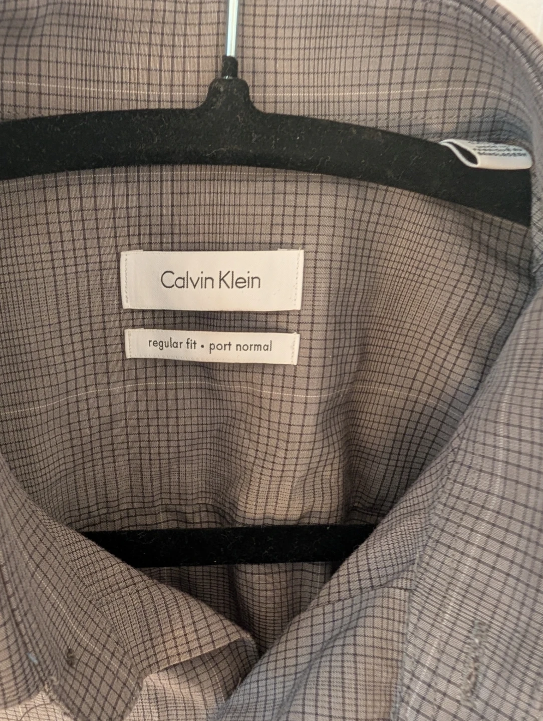 Calvin Klein long sleeve dress shirt in a grey plaid pattern. It's a regular fit with a port collar. Material is a blend, soft to the touch. Easy to dress up or down!