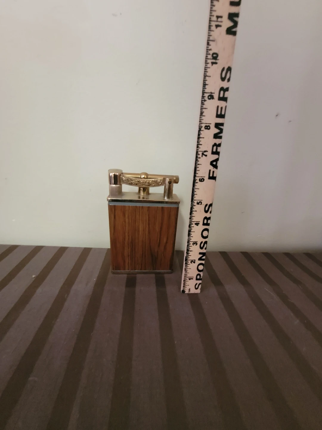 A classic Sabre Made in Japan Vintage Table lighter featuring a wood-grain effect on the body with gold-tone accents. This lighter has a distinct ornate lever. It's a statement piece for any collection. In great condition would need gas and a flint used once year ago. Asking $50 pick up on beaverbrook lane Kanata thank you