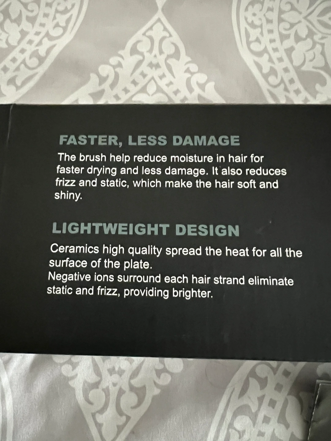 One-step hair dryer and styler. This hot air brush is a great tool for styling your hair. It comes with a cord, instructions . It has three heat settings and is lightweight.