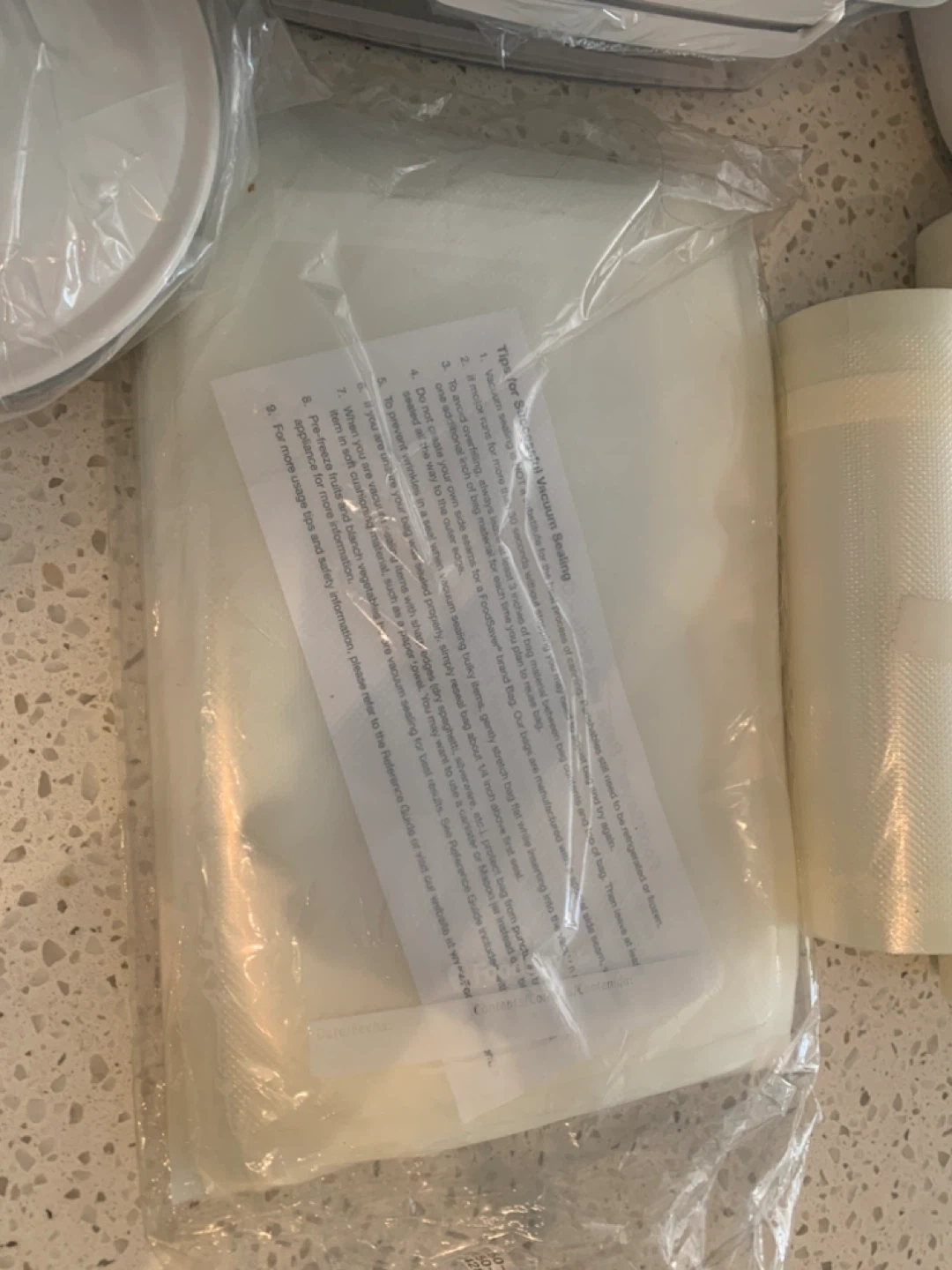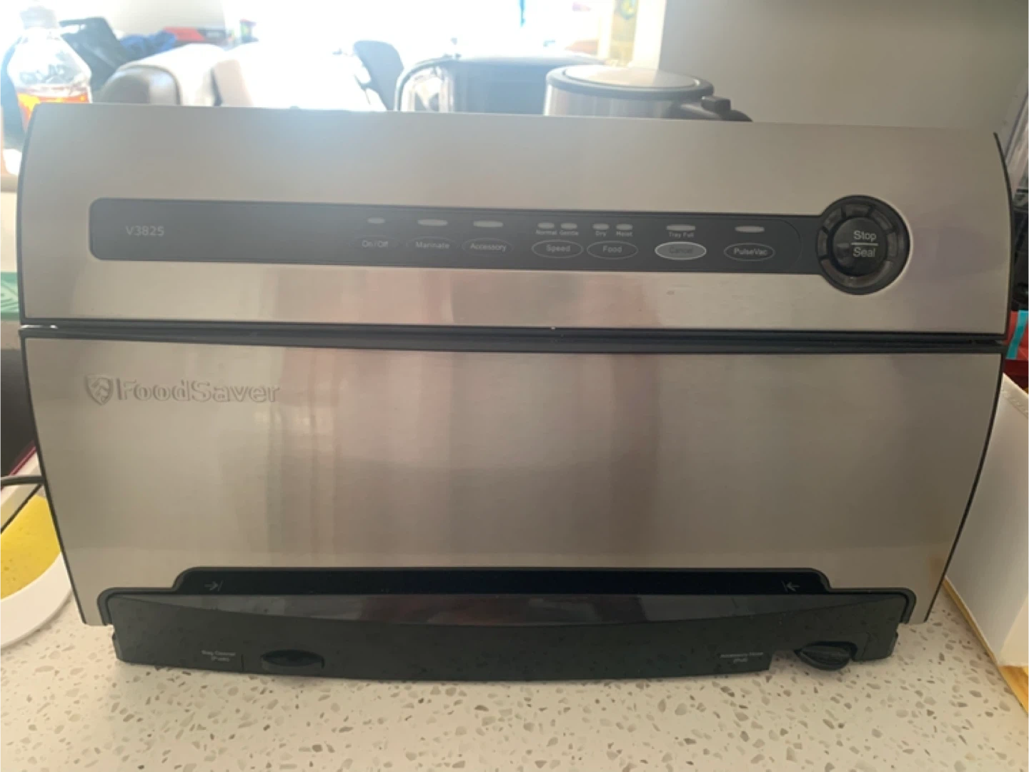 FoodSaver V3825 vacuum sealing system. Comes with a set of five vacuum seal rolls & several containers. It's great for preserving food and keeping it fresh longer. The appliance includes a quick start guide and user manual.