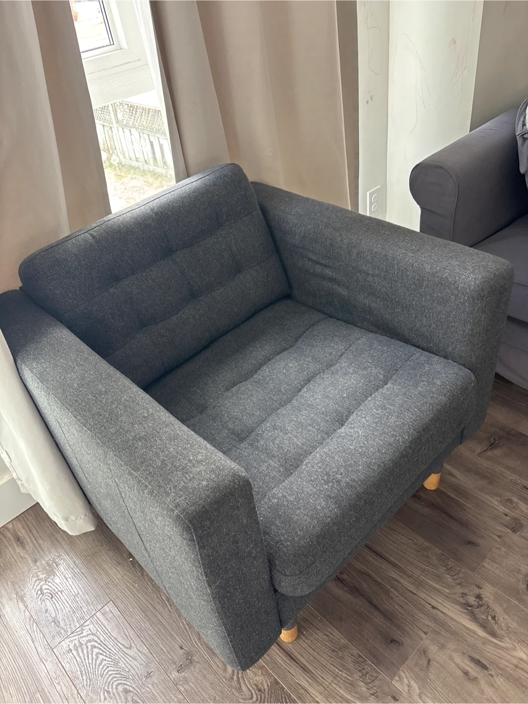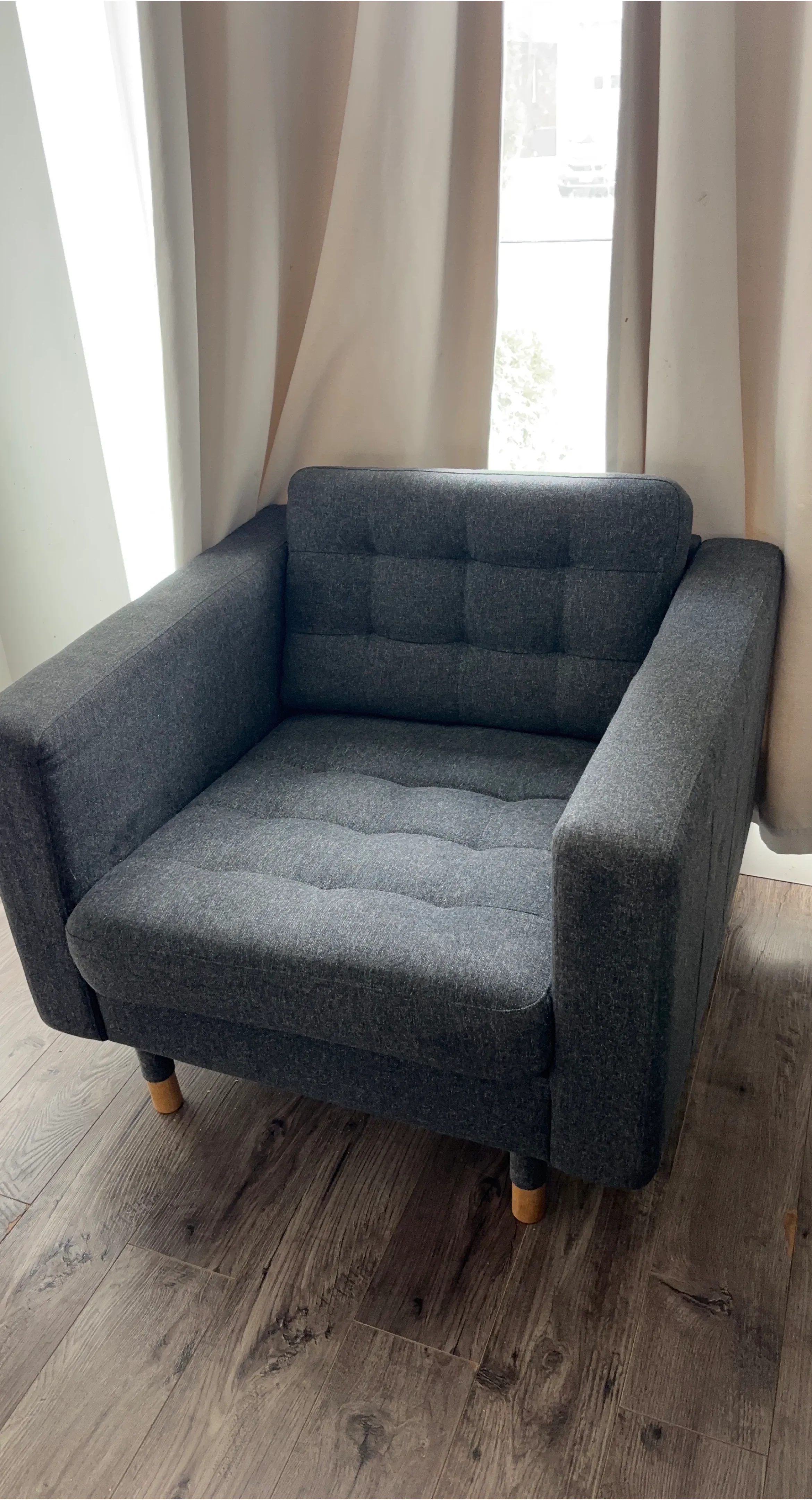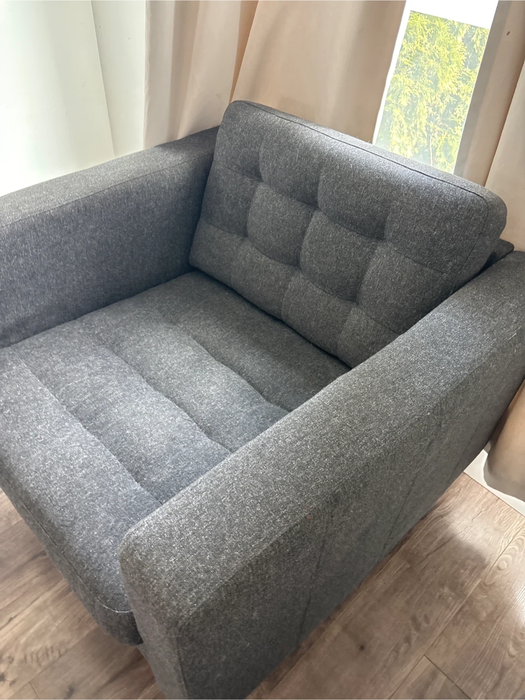 Comfortable grey armchair with tufted cushions. It's upholstered in a durable fabric with wooden legs. Adds a cozy touch to any living space. Perfect for a reading nook!