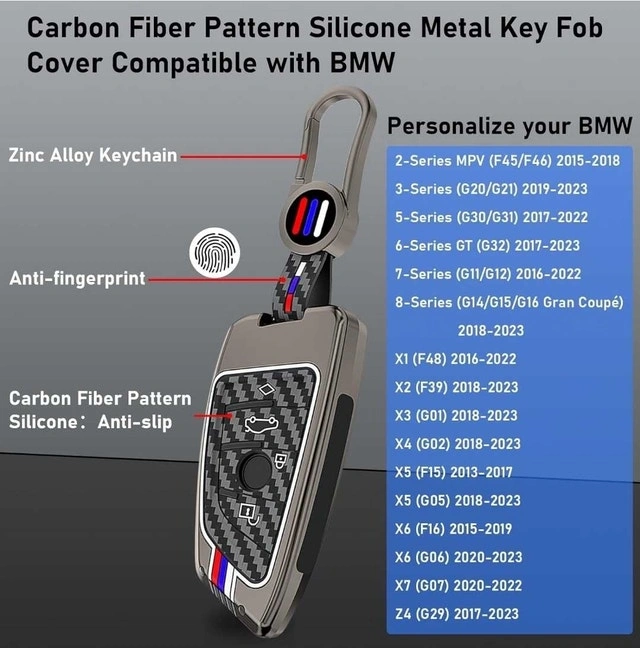 In great condition. This premium gunmetal finish cover makes your BMW fob look better than ever and protects it. It also glows in the dark! Compatible with 2'F45/F46 (2015-2018), 3'G20/G21 (2019-2023), 5'G30/G31 (2017-2022), 6'G32 (2017-2023), 7'G11/G12 (2016-2022), 8'G14/G15/G16 Gran Coupé (2018-2023), X1 F48 (2016-2022), X2 F39 (2018-2023), X3 G01 (2018-2023), X4 G02 (2018-2023), X5 F15/F85 (2013-2023), X6 F16/F86 (2015-2023), X7 G07 (2020-2022), Z4 G29 (2017-2023).