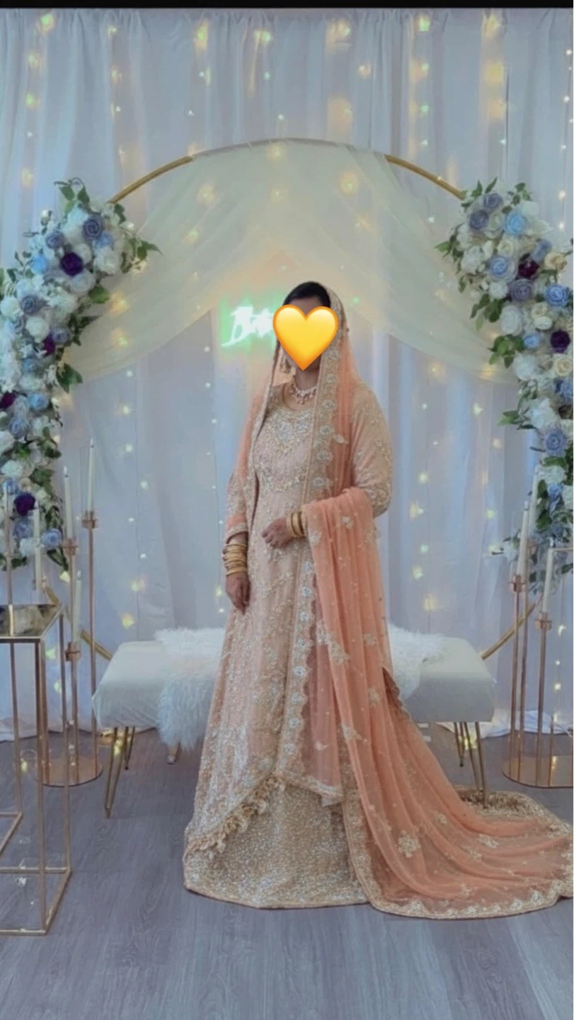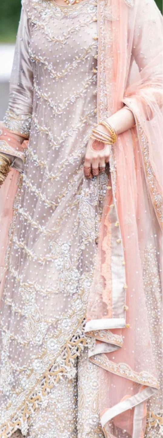 A stunning kameez featuring intricate white and gold beadwork and embroidery. It comes with a matching peach dupatta . This outfit is perfect for formal events or celebrations!