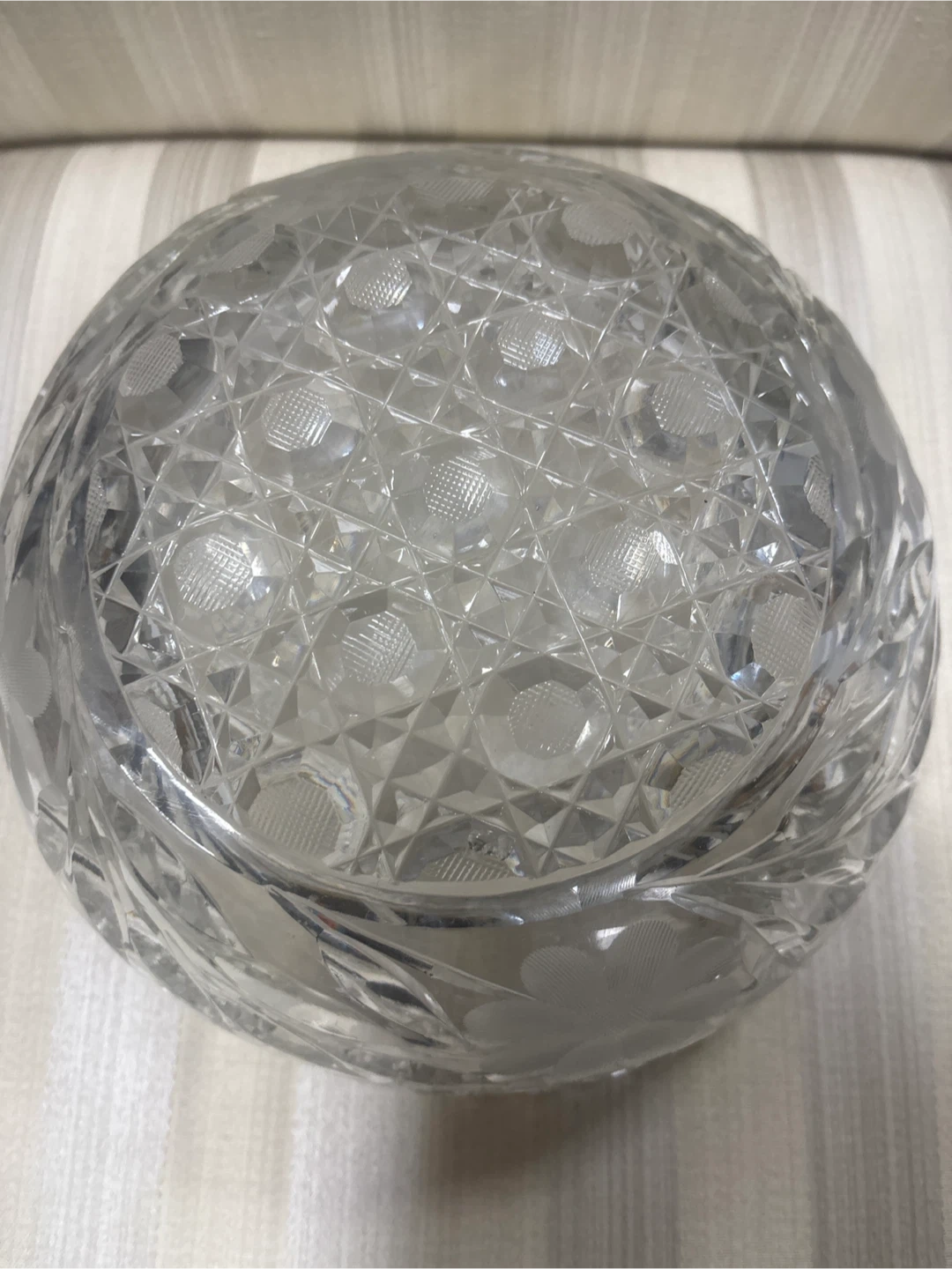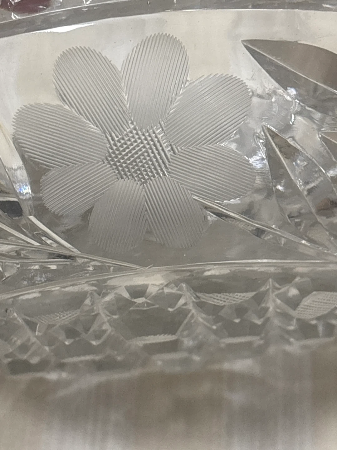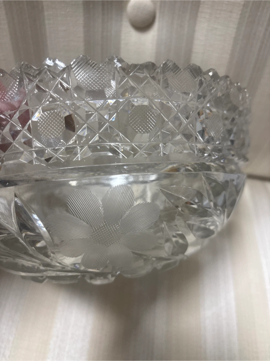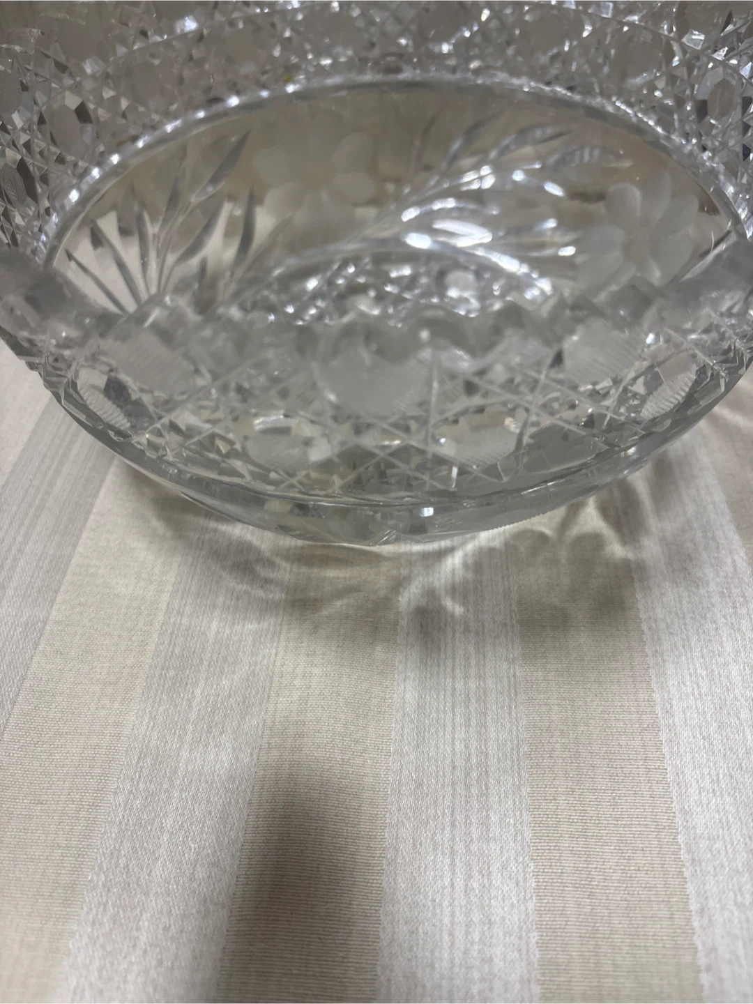 Beautiful vintage crystal bowl. Features intricate cut glass patterns and a delicate floral etching. It's a lovely piece for serving or display!