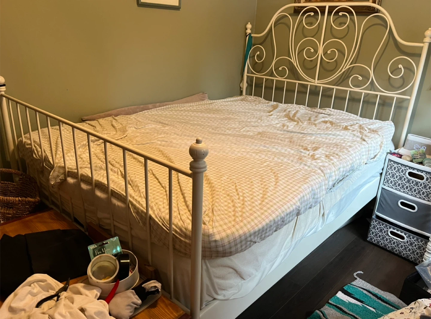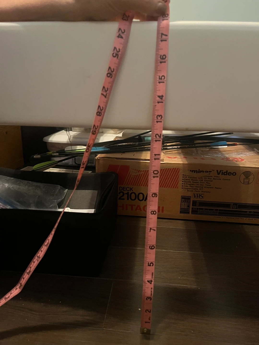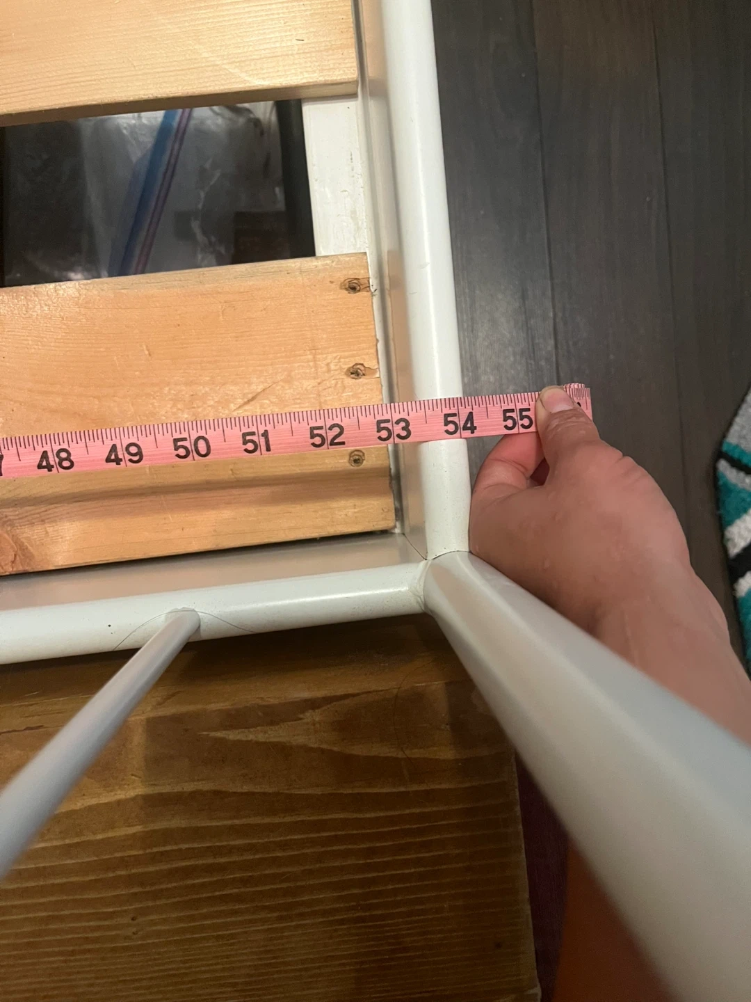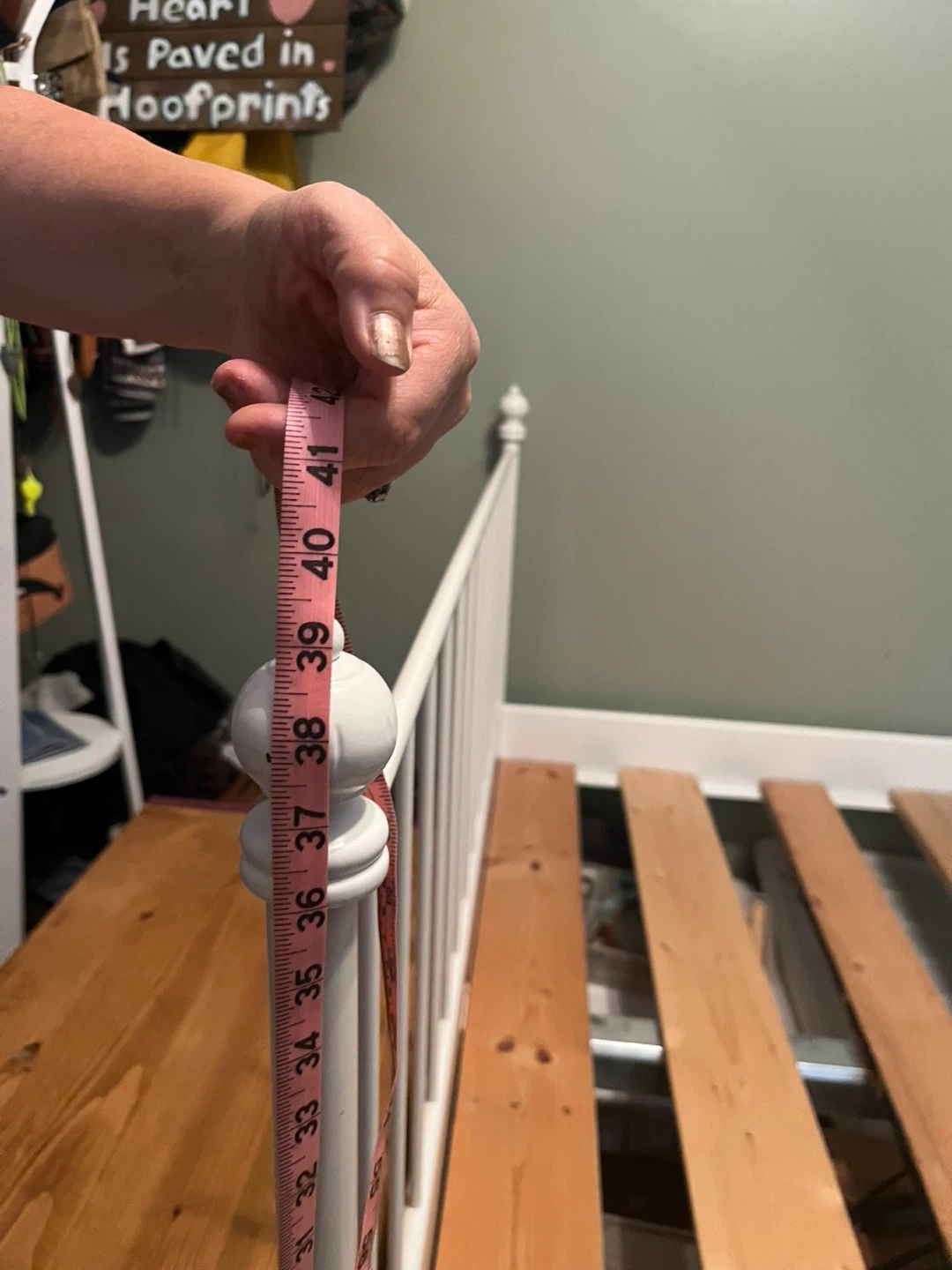 The frame is like new. It’s 53 1/2 inches wide. Headboard is 58 inches tall and the end board is 39 inches tall. There is 12.5 inches of clearance under the bed.