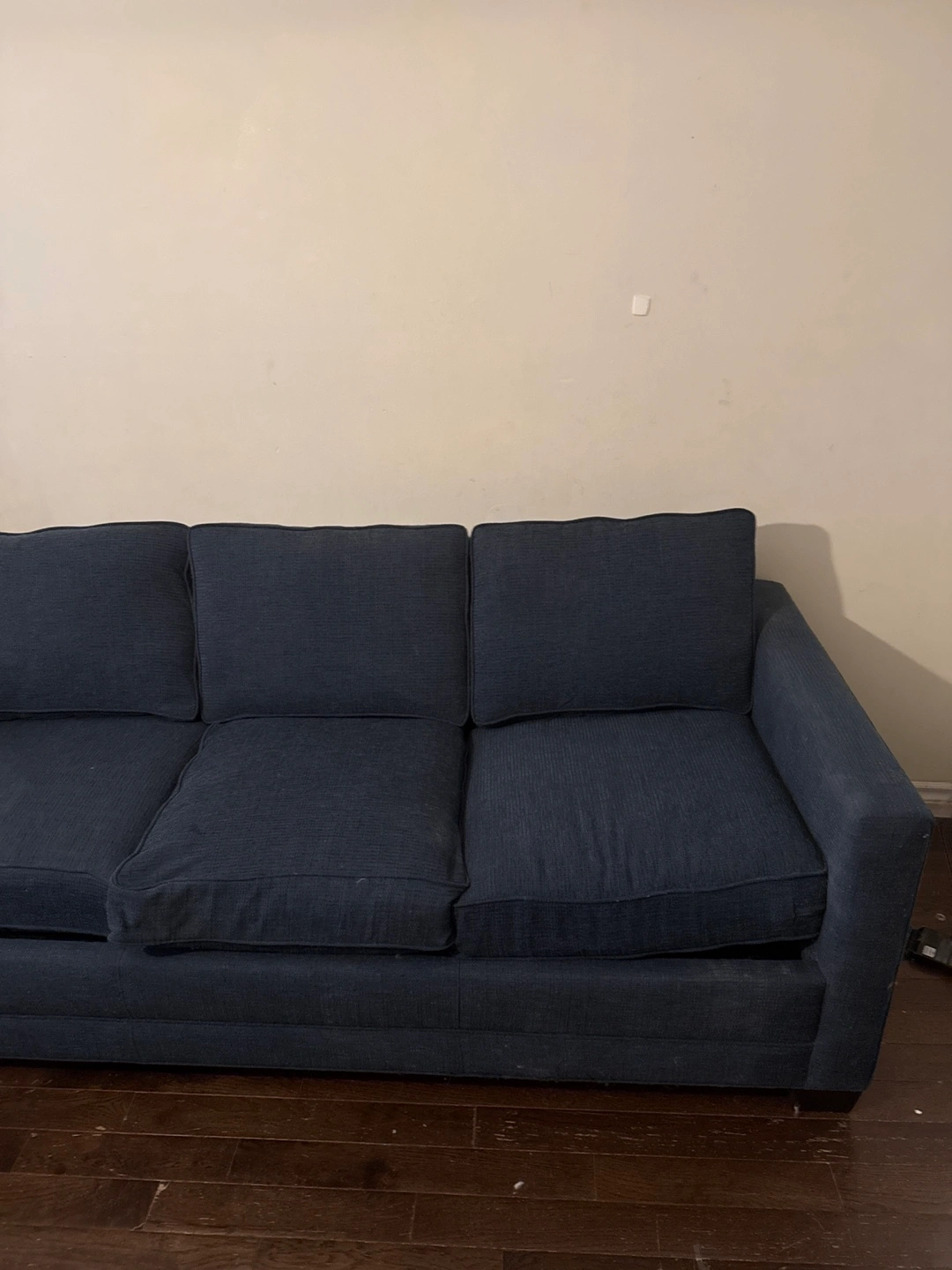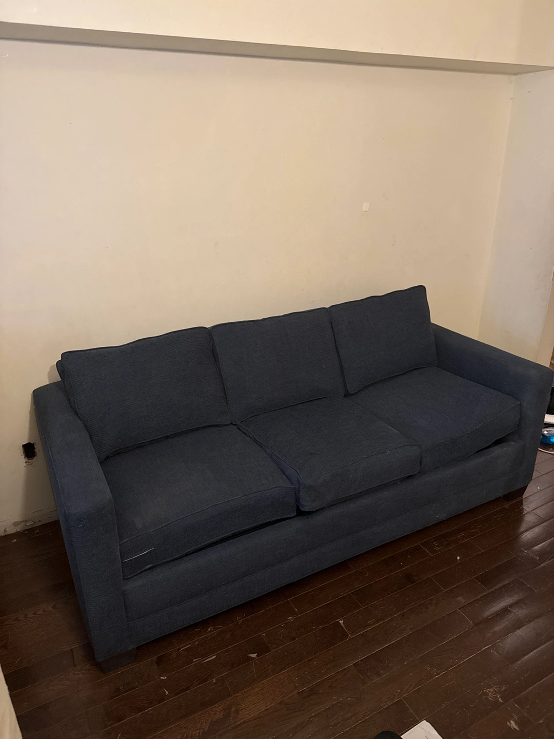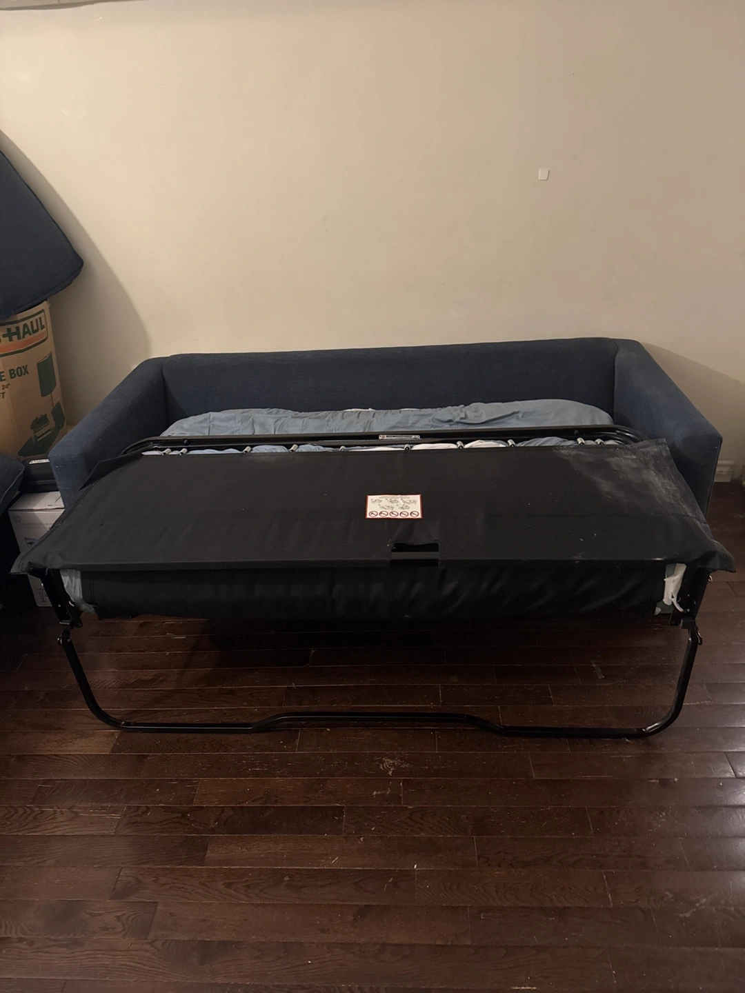 Futon, Three-seater sofa, dark blue fabric. Hand crafted spent $3000 on this 2 years ago. Barely used. The couch dimensions are 190cm - 85cm and the bed is 180cm - 150cm