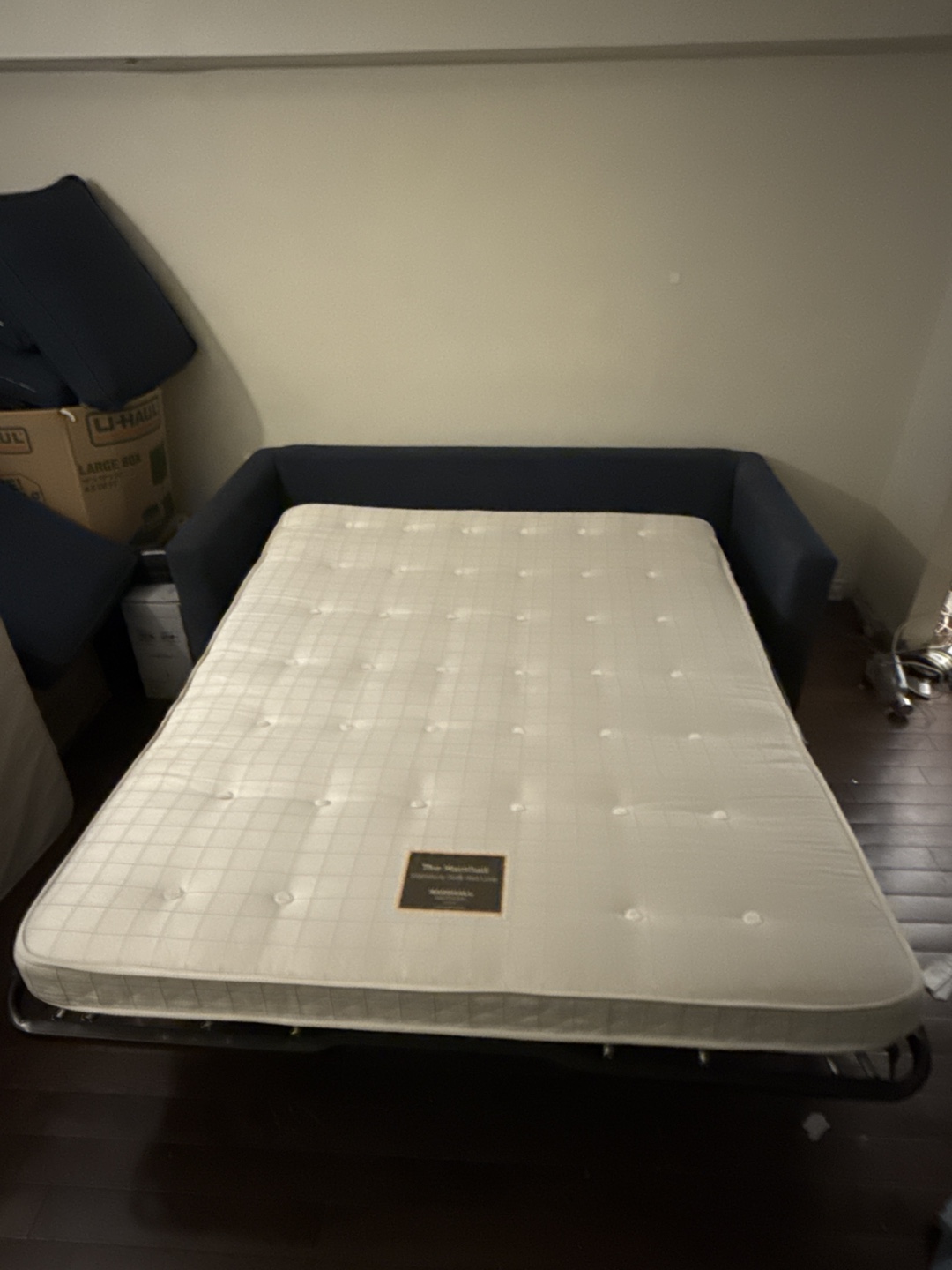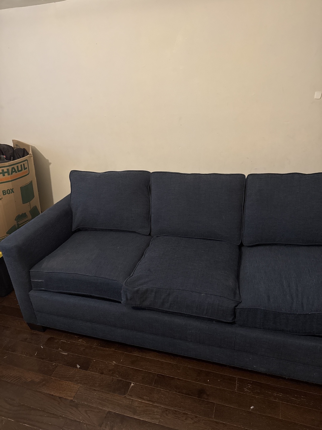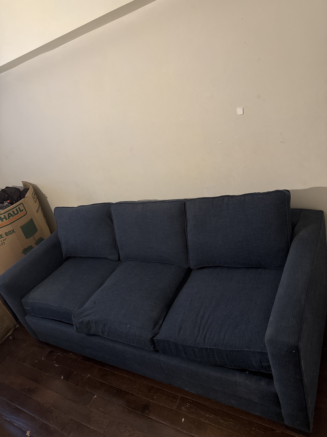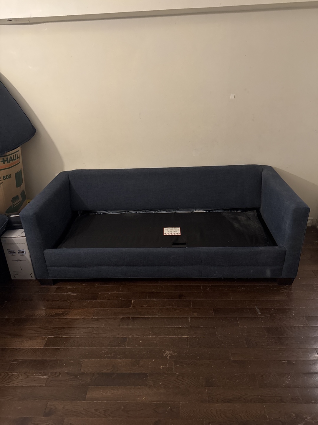 Futon, Three-seater sofa, dark blue fabric. Hand crafted spent $3000 on this 2 years ago. Barely used. The couch dimensions are 190cm - 85cm and the bed is 180cm - 150cm