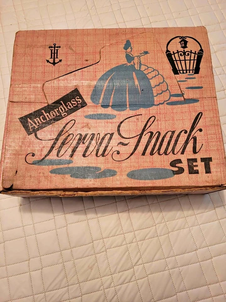 Vintage Anchor Hocking Anchorglass Serva Snack Set, 8 pieces. Contains 4 Serving Trays & 4 Red Cups in original box. Cups are deep red and the plates are clear with a retro bubble pattern. Pickup is Garden and Burns area, Whitby.