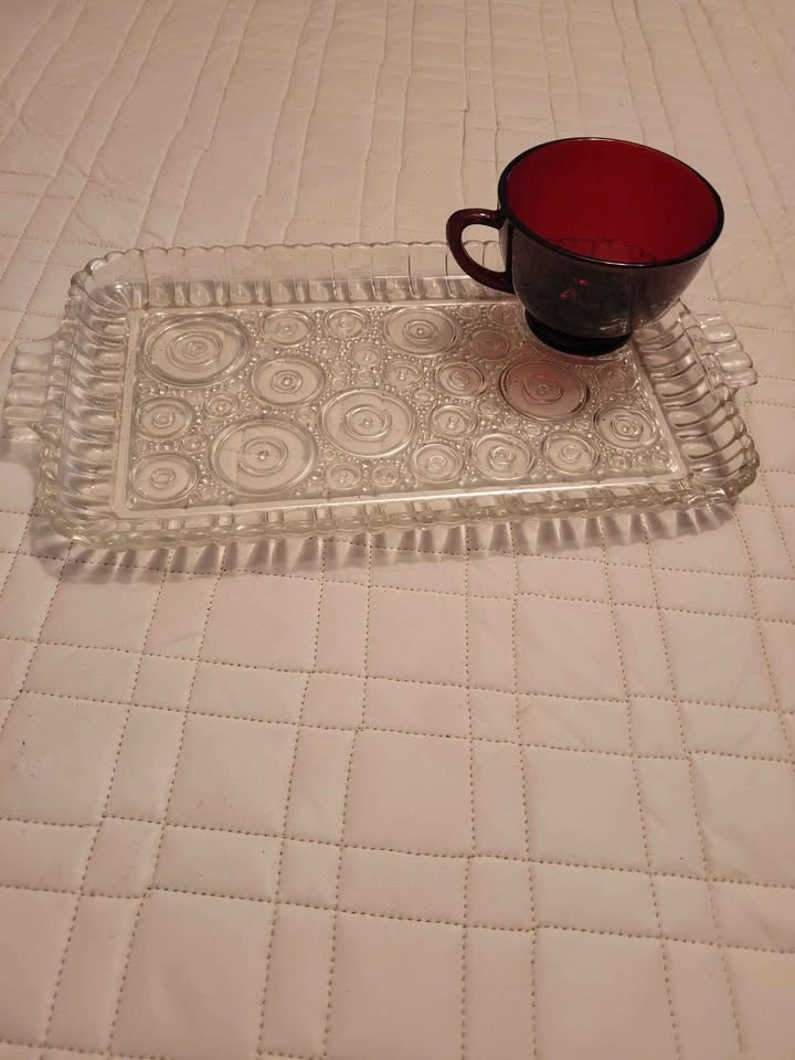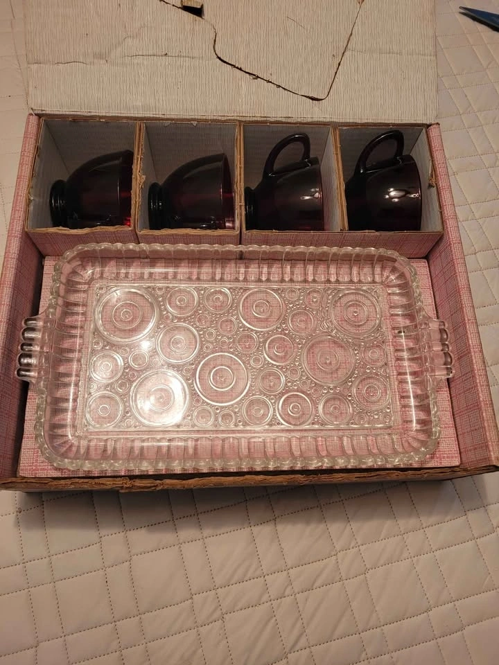 Vintage Anchor Hocking Anchorglass Serva Snack Set, 8 pieces. Contains 4 Serving Trays & 4 Red Cups in original box. Cups are deep red and the plates are clear with a retro bubble pattern. Pickup is Garden and Burns area, Whitby.