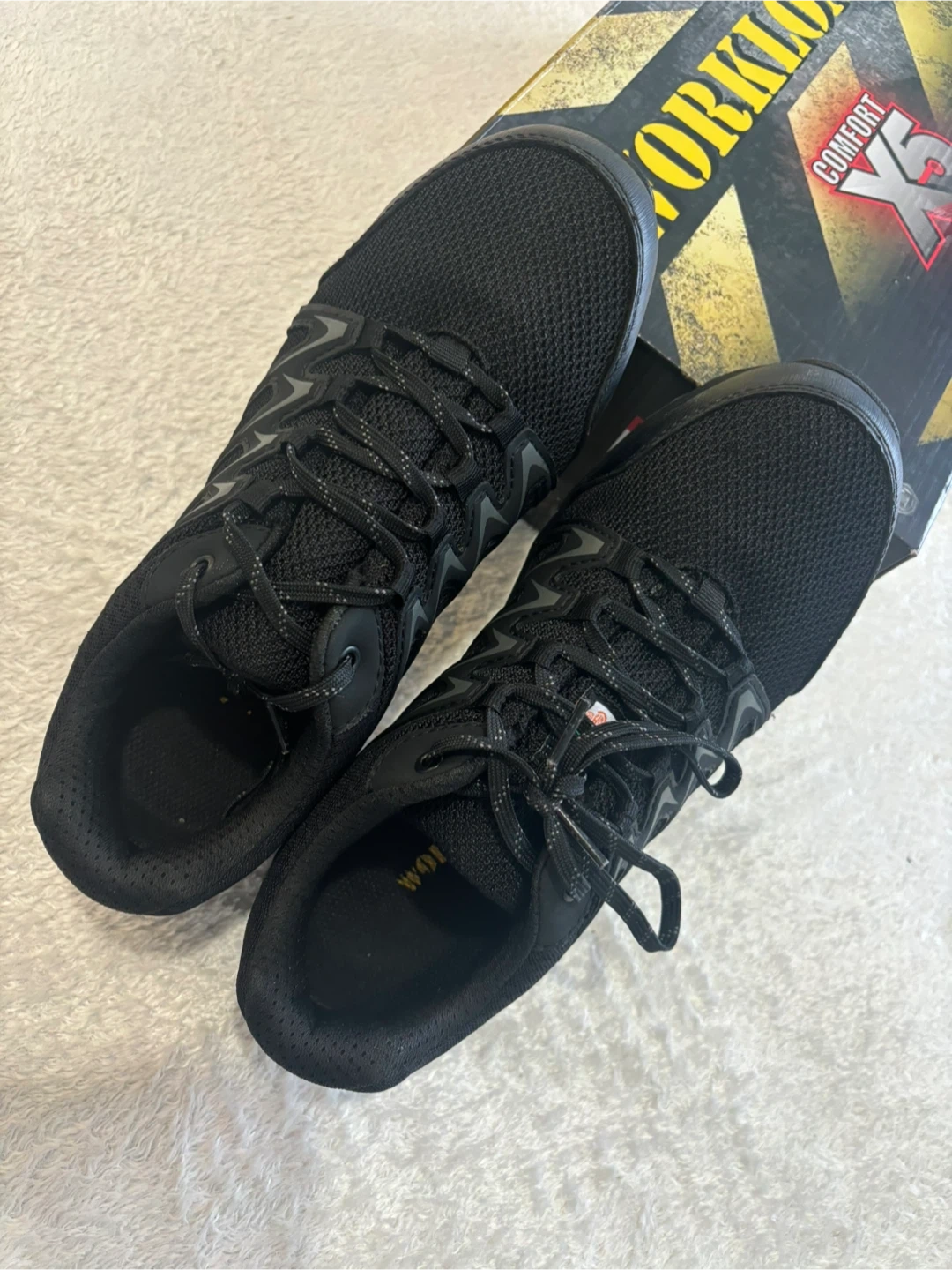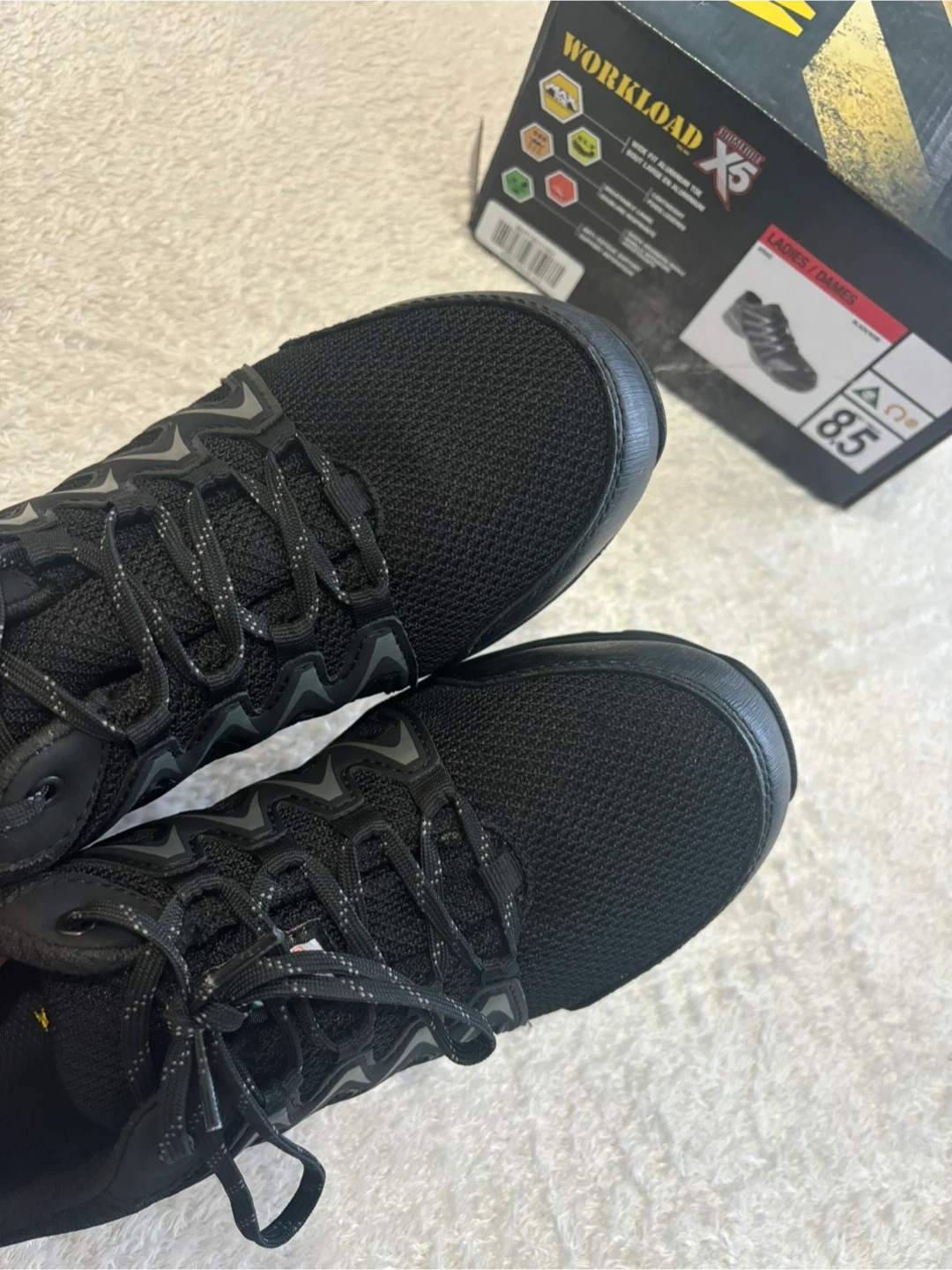 These black Workload Comfort X5 safety shoes are a ladies size 8.5. They feature a wide fit aluminum toe and a breathable lining. The shoes also include shock absorbing insoles and anti-fatigue support.