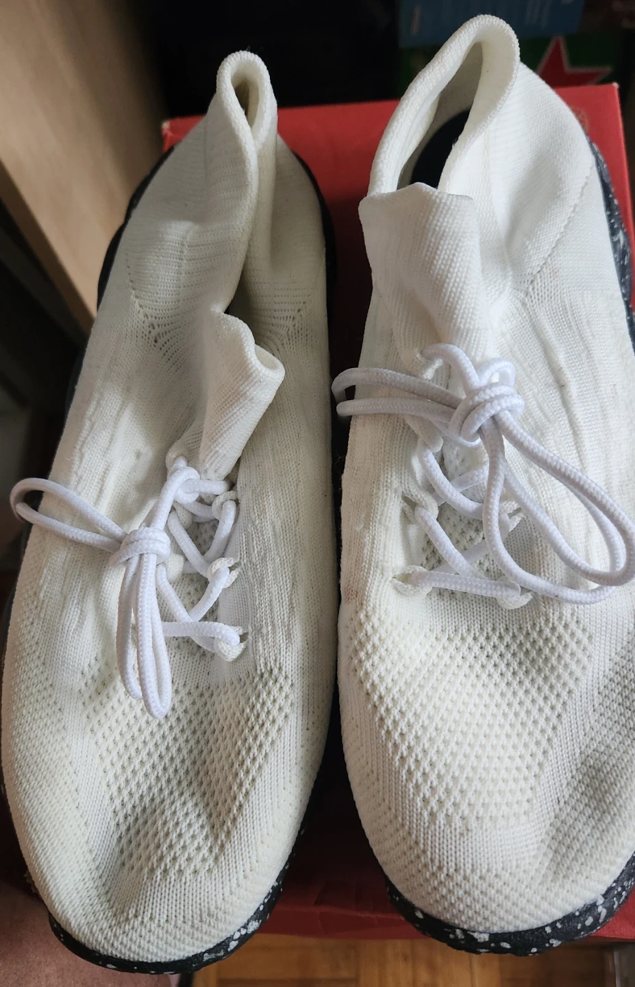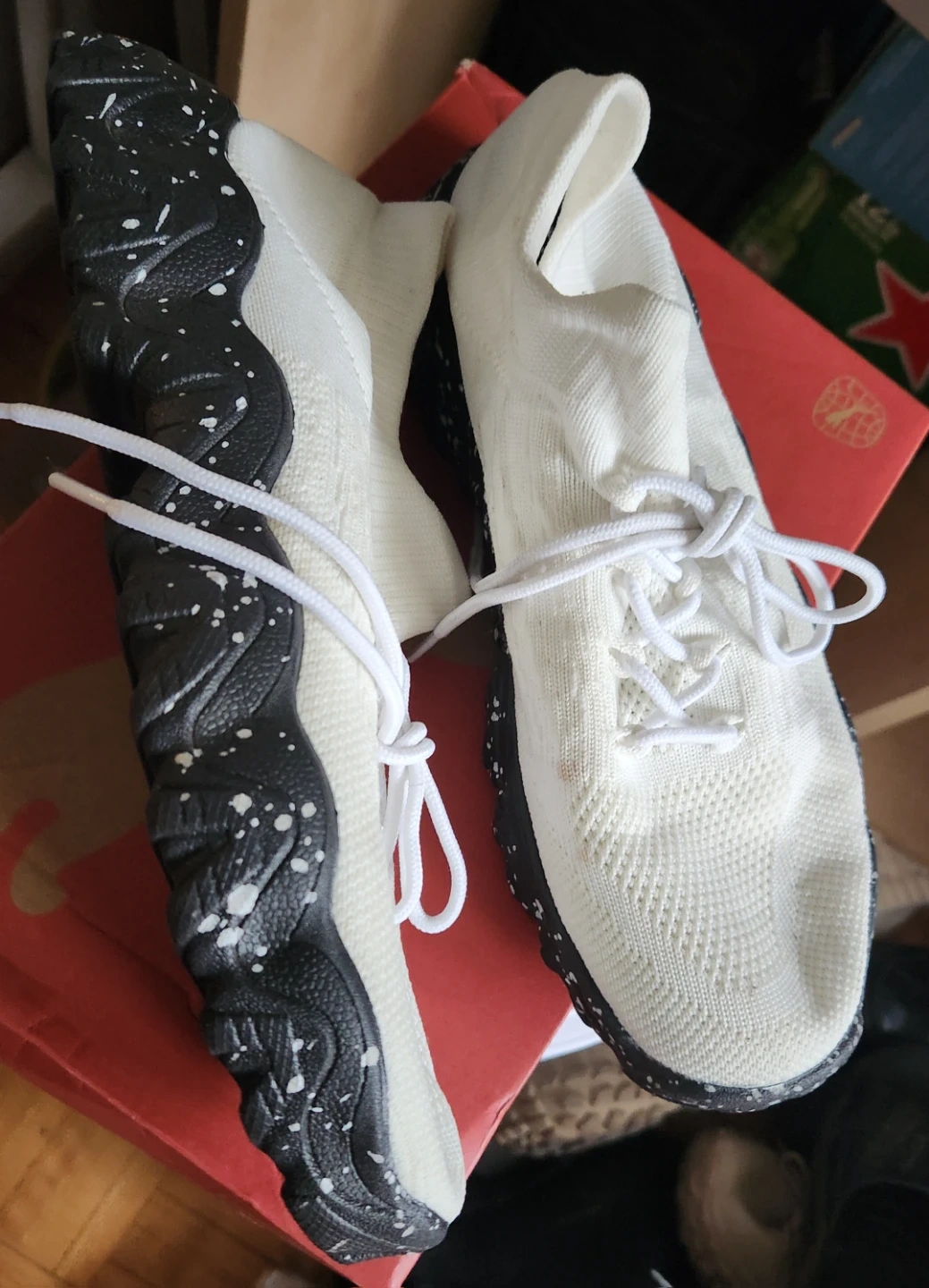 White Knit Sneakers with Black Speckled Soles