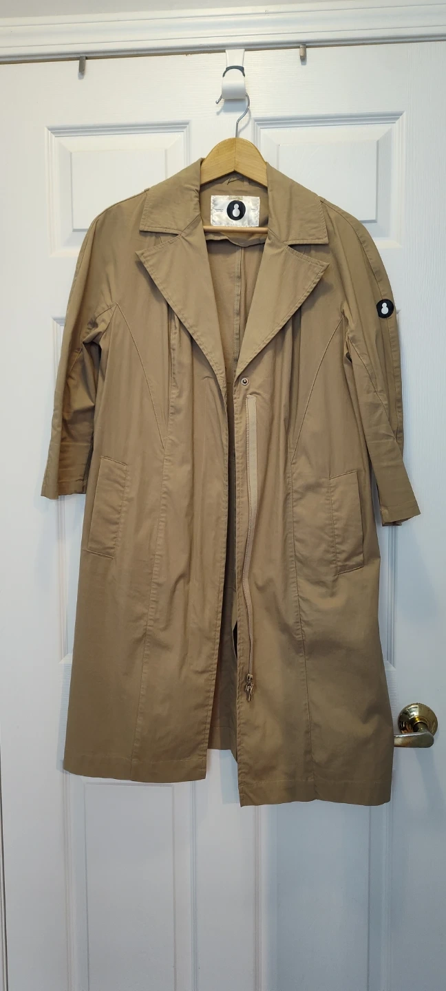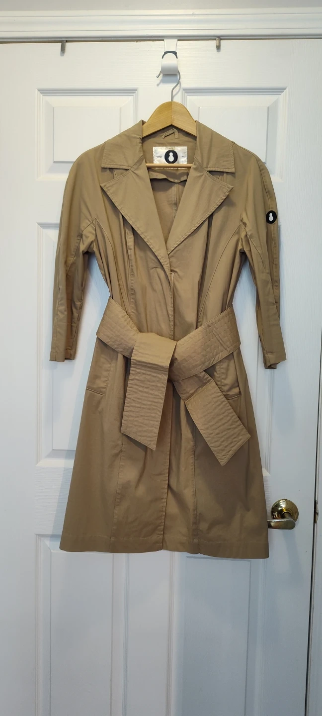 A stylish khaki trench coat, perfect for layering. It features a tie belt and classic collar. This coat offers a mid-length cut and a lightweight feel.