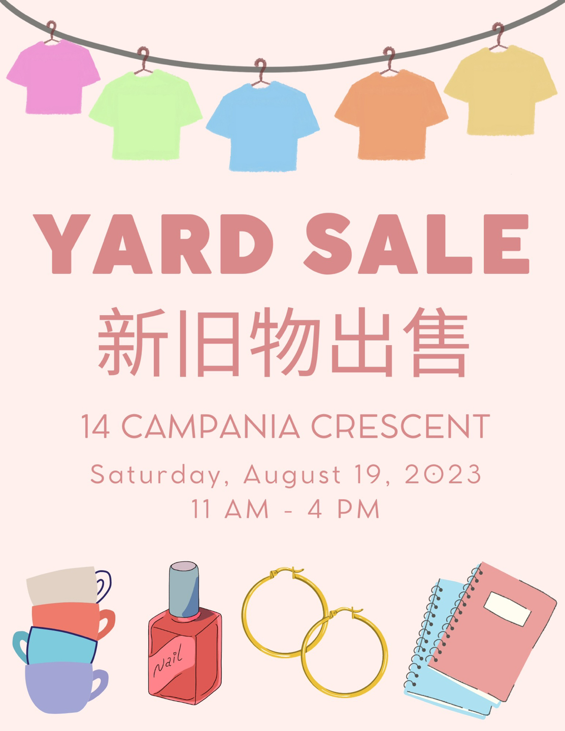 Yard sale this Saturday (Aug 19) from 11am to 4pm. Will be selling a variety of items such as clothing, jewelry, kids’ toys, household items, and many miscellaneous items!