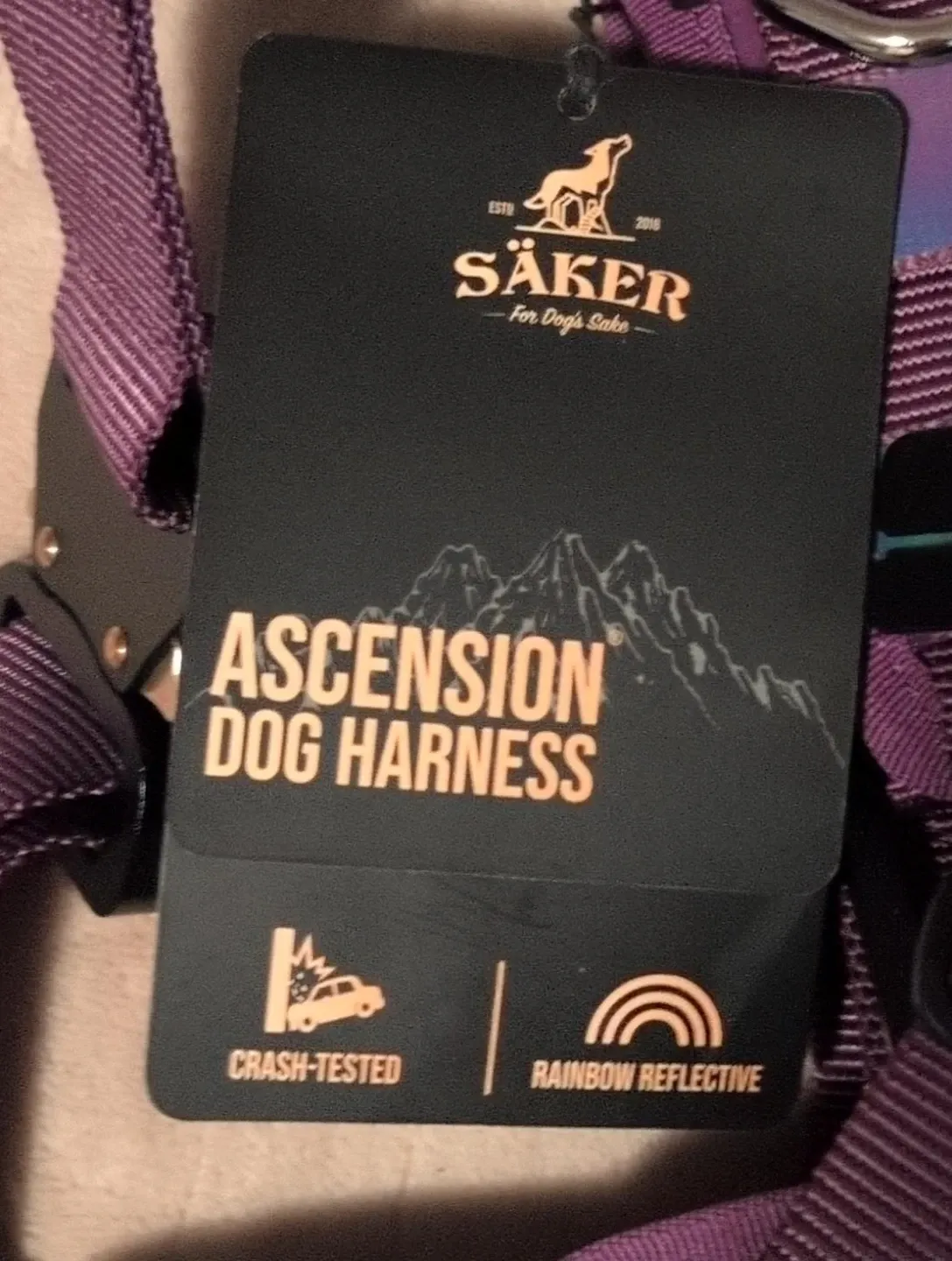 This Säker Ascension dog harness is designed for your dog's safety. It's crash-tested and features rainbow reflective elements for visibility. The harness comes with two detachable pouches for carrying essentials. Made from durable materials for outdoor adventures.