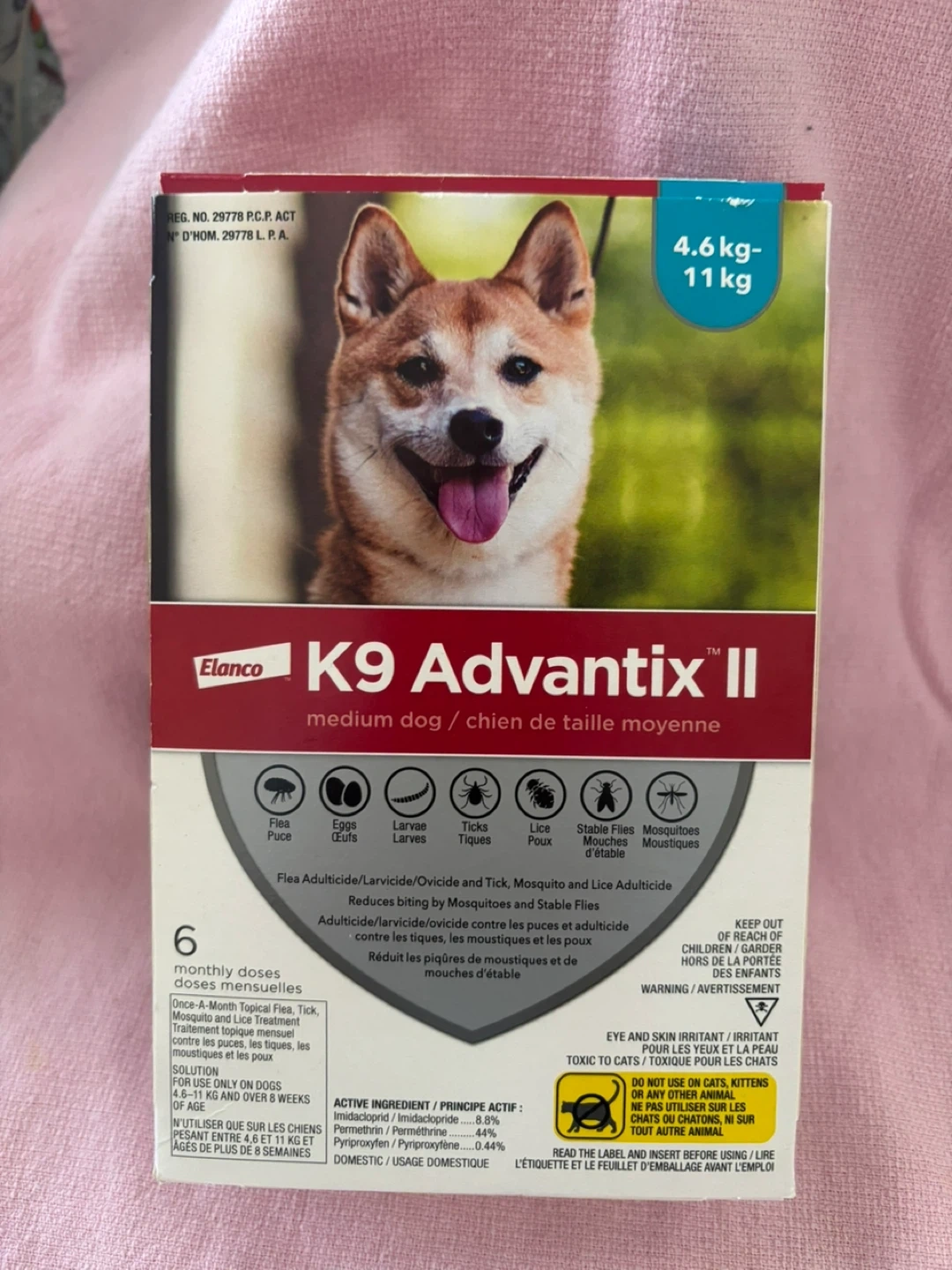 This is a box of Elanco K9 Advantix II for medium dogs, weighing 4.6 to 11 kg. It includes 6 monthly doses for flea, tick, mosquito, and lice treatment. Active ingredients are Imidacloprid, Permethrin, and Pyriproxyfen.