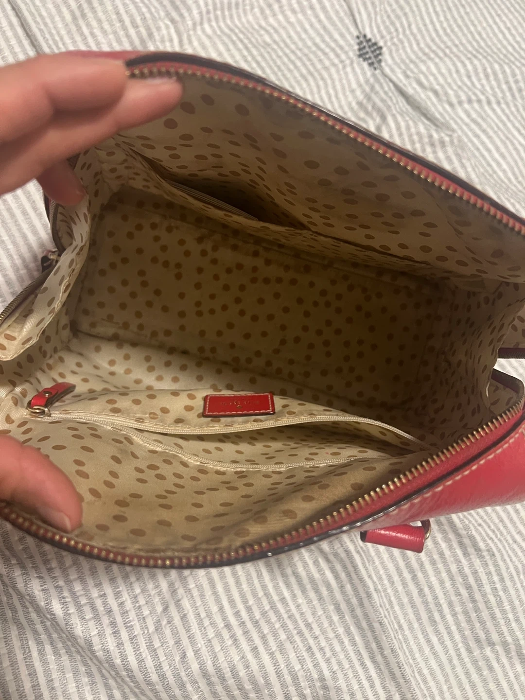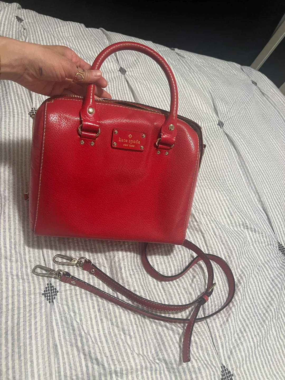 Like new Red leather satchel handbag from Kate Spade. It's a classic dome shape with top handles and an optional shoulder strap. Interior has polka dot lining and several pockets for organization.
