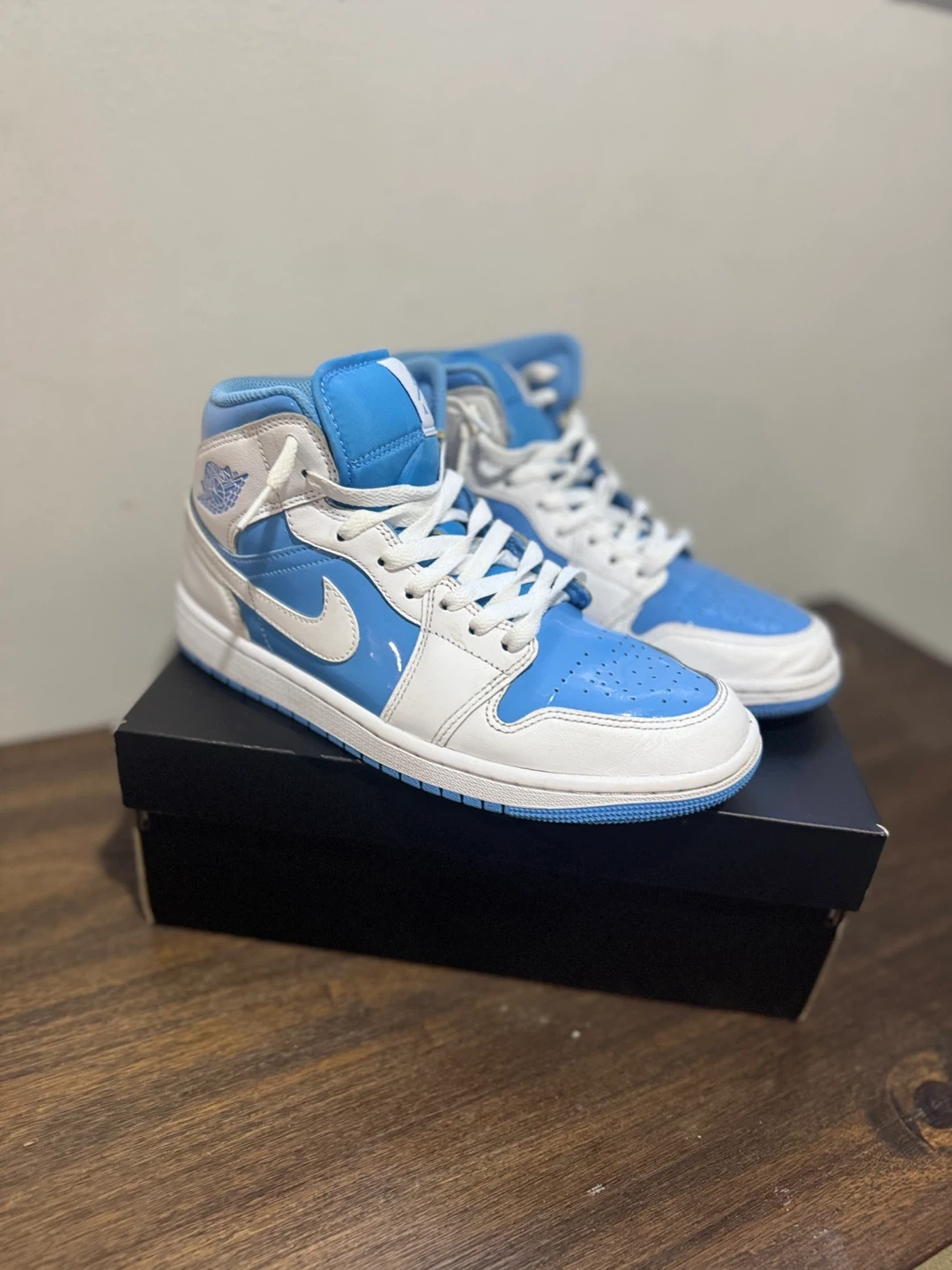 White and light blue Air Jordan 1 Mid SE sneakers. Includes original box. Negotiable. lowest i can go is 140 Canadian, cash only