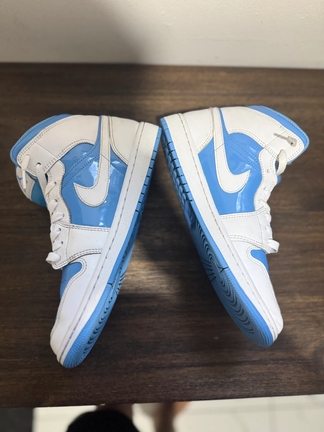 White and light blue Air Jordan 1 Mid SE sneakers. Includes original box. Negotiable. lowest i can go is 140 Canadian, cash only