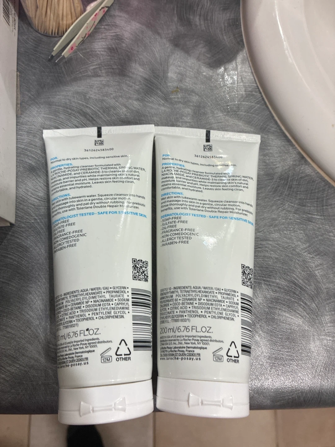 Two tubes of La Roche-Posay Toleriane Hydrating Gentle Cleanser, 200ml each. Formulated for normal to dry skin, it's soap, sulfate, and fragrance-free. Dermatologist tested for sensitive skin, it gently cleanses while retaining essential moisture.