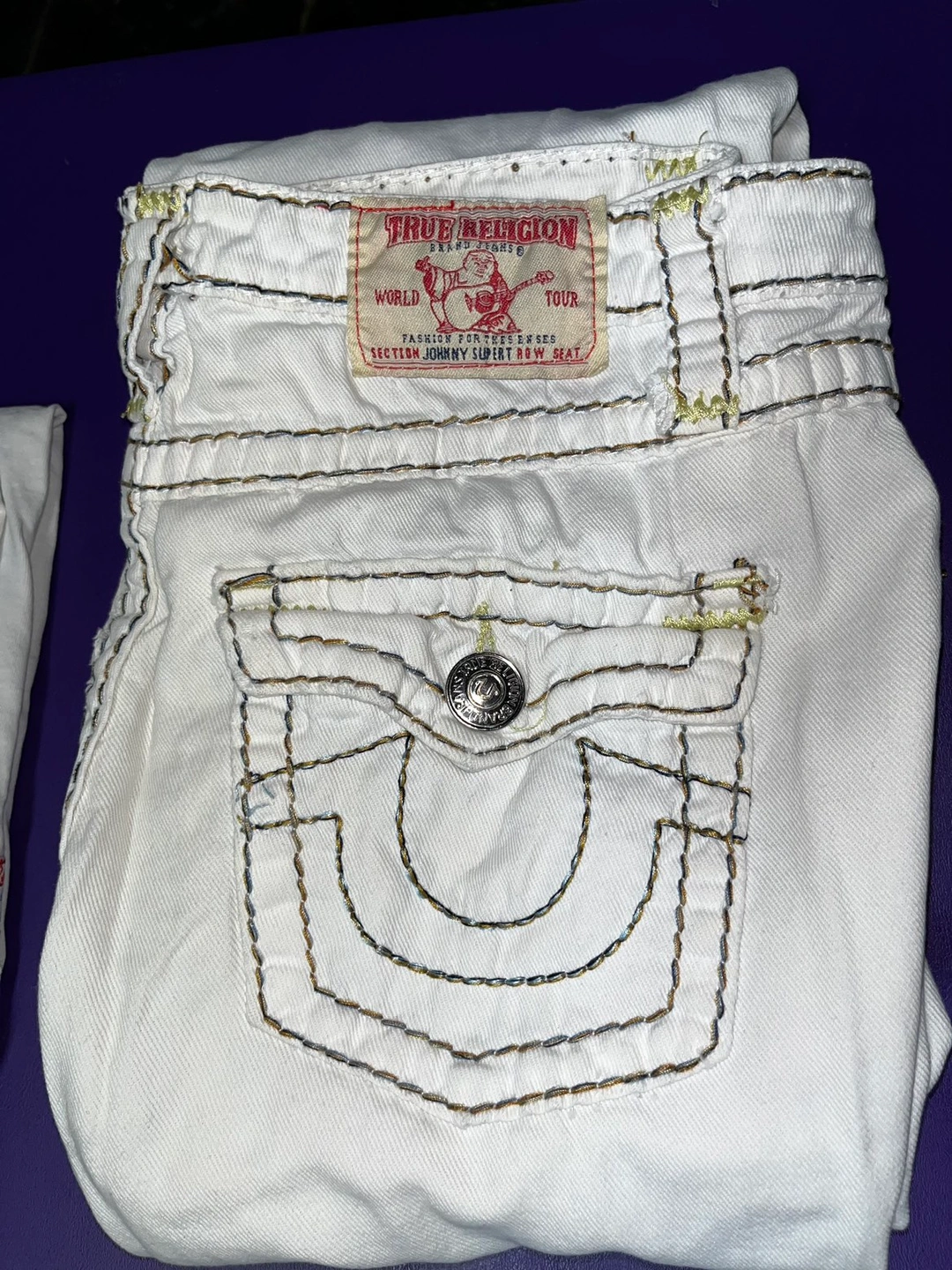 White True Religion Jeans jeans (SIZE 26) it has a little stain but it’s not too noticeable. True Religion Tee is a Size SMALL.