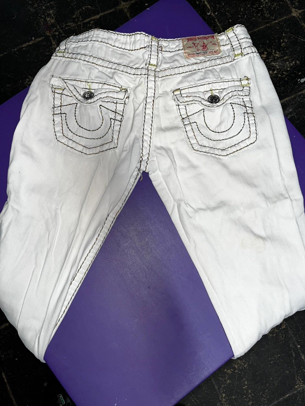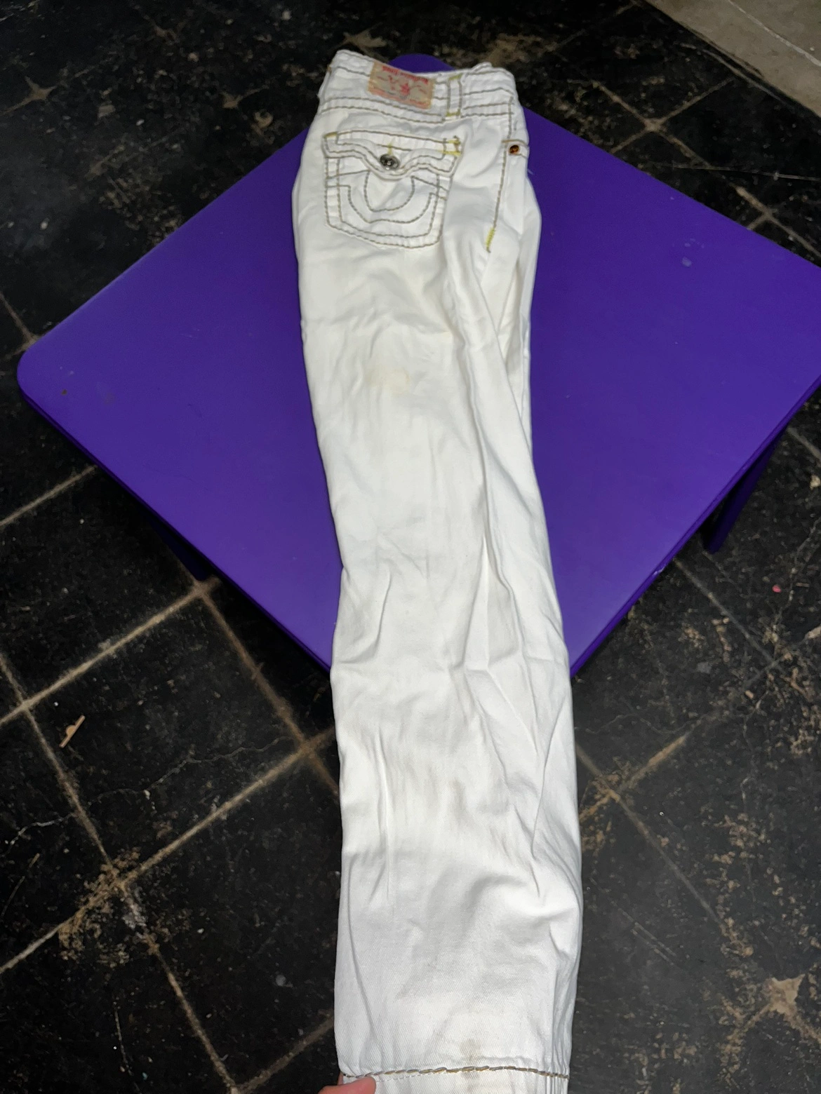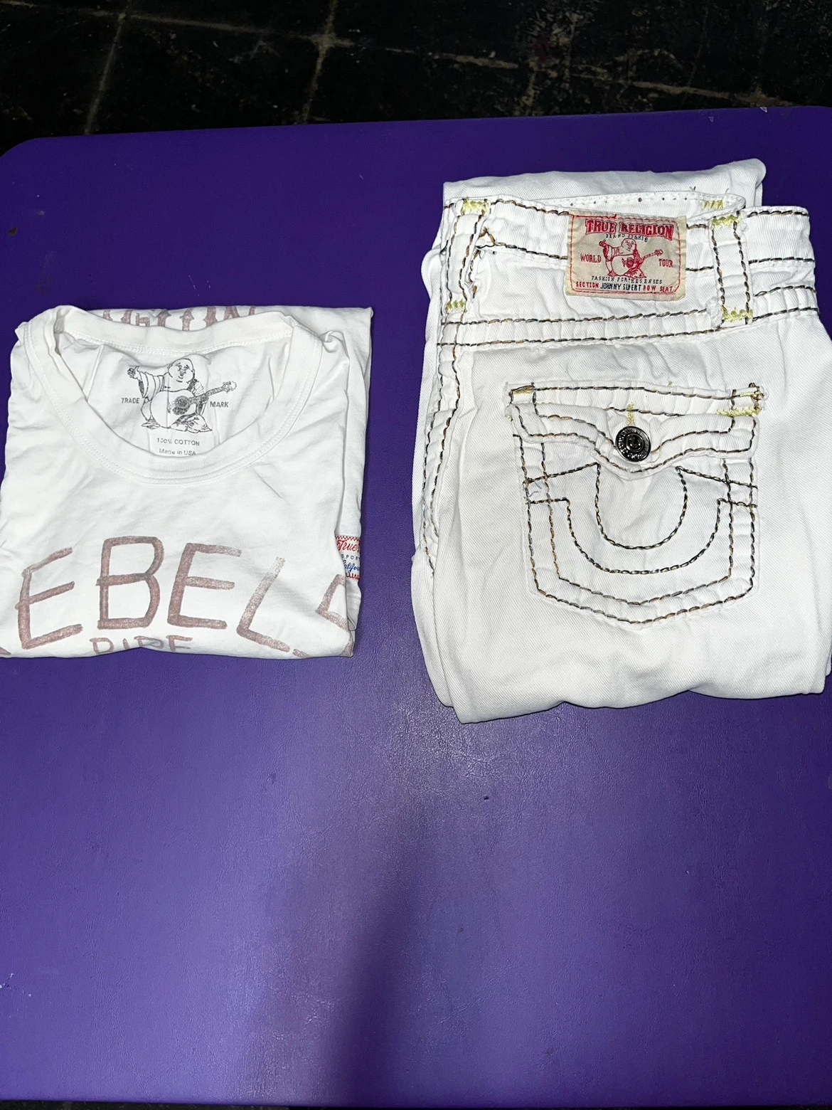 White True Religion Jeans jeans (SIZE 26) it has a little stain but it’s not too noticeable. True Religion Tee is a Size SMALL.
