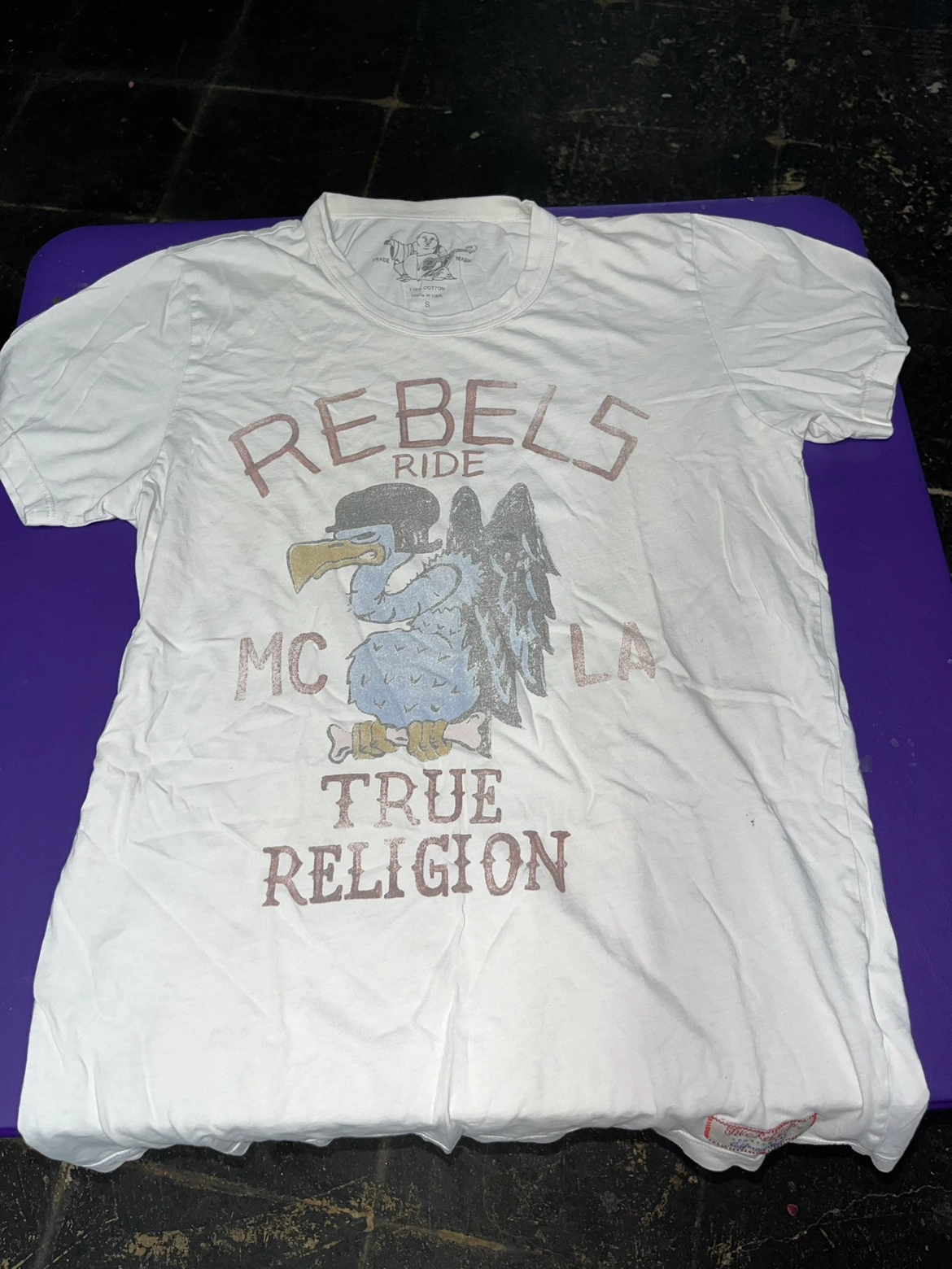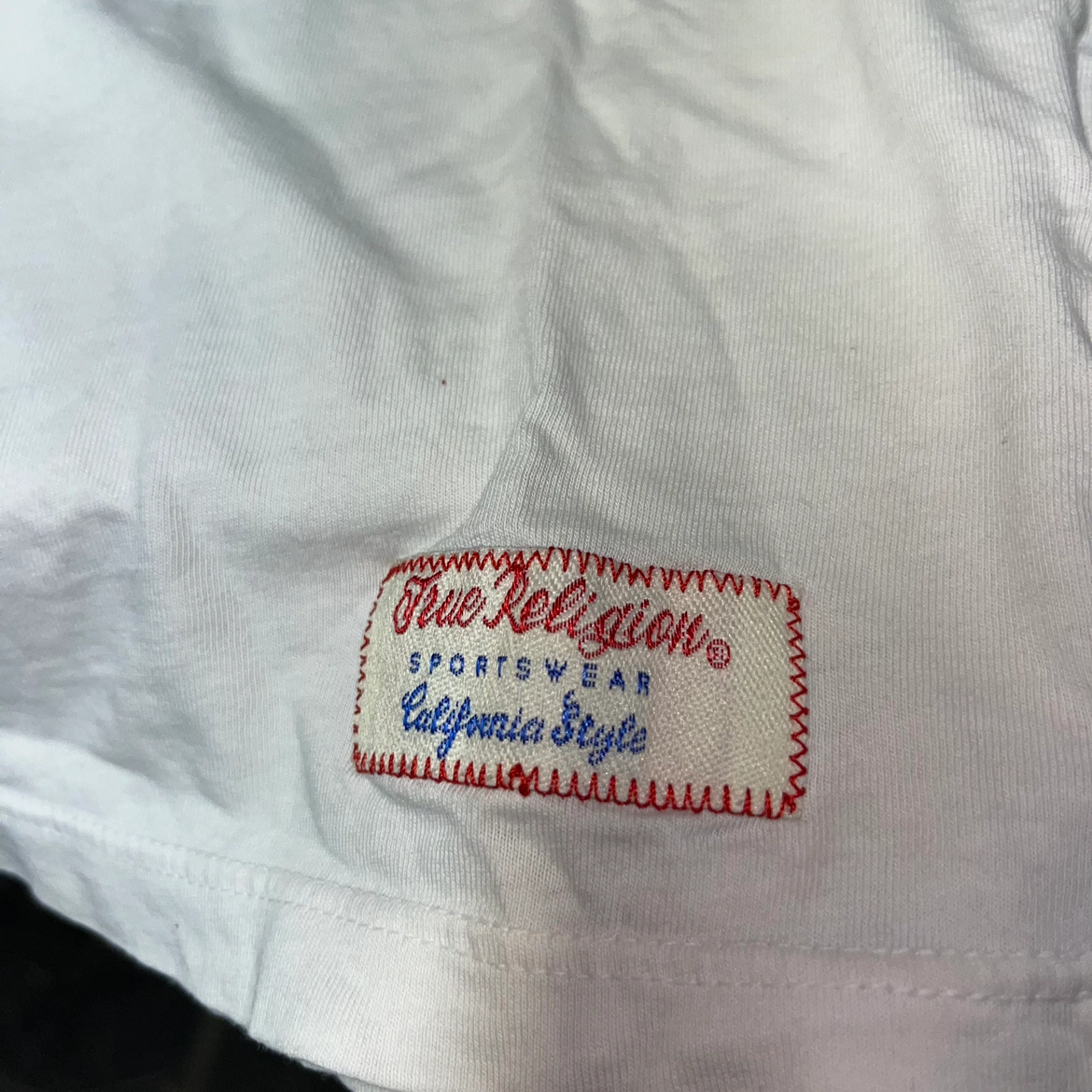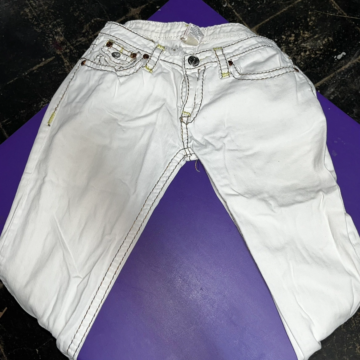 White True Religion Jeans jeans (SIZE 26) it has a little stain but it’s not too noticeable. True Religion Tee is a Size SMALL.